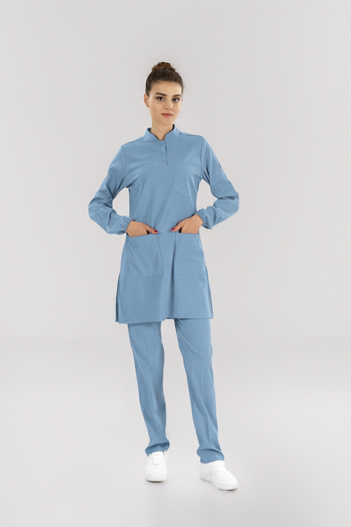 Alaskan Blue Tesettür Hakim Yaka Doktor Hemşire Medikal Scrubs Takım Lüks Likralı Kumaş, tesettürlü sağlık personelleri için özel olarak tasarlanmıştır. Uzun kollu yapısı ve normal cerrahi takımlardan 12 cm daha uzun etek boyu ile tesettür giyim standartlarına uygundur.