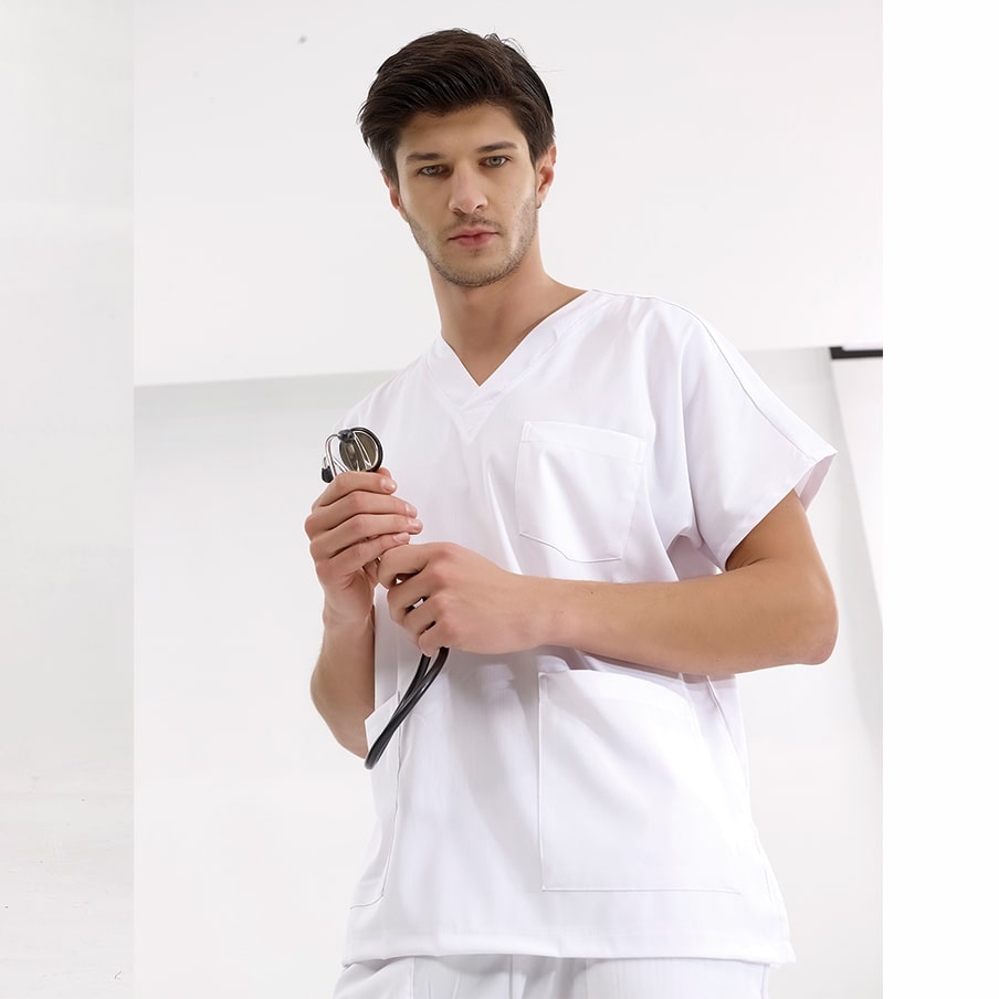 Белый Медицинский Костюм Jogger для Врачей и Медсестер Ткань Люкс Лайкра — это хирургический комплект с V-образным вырезом и брюками-джоггерами, разработанный для комфорта и элегантности медицинских работников. Обеспечивает функциональность благодаря детали кармана карго и эластичным манжетам.