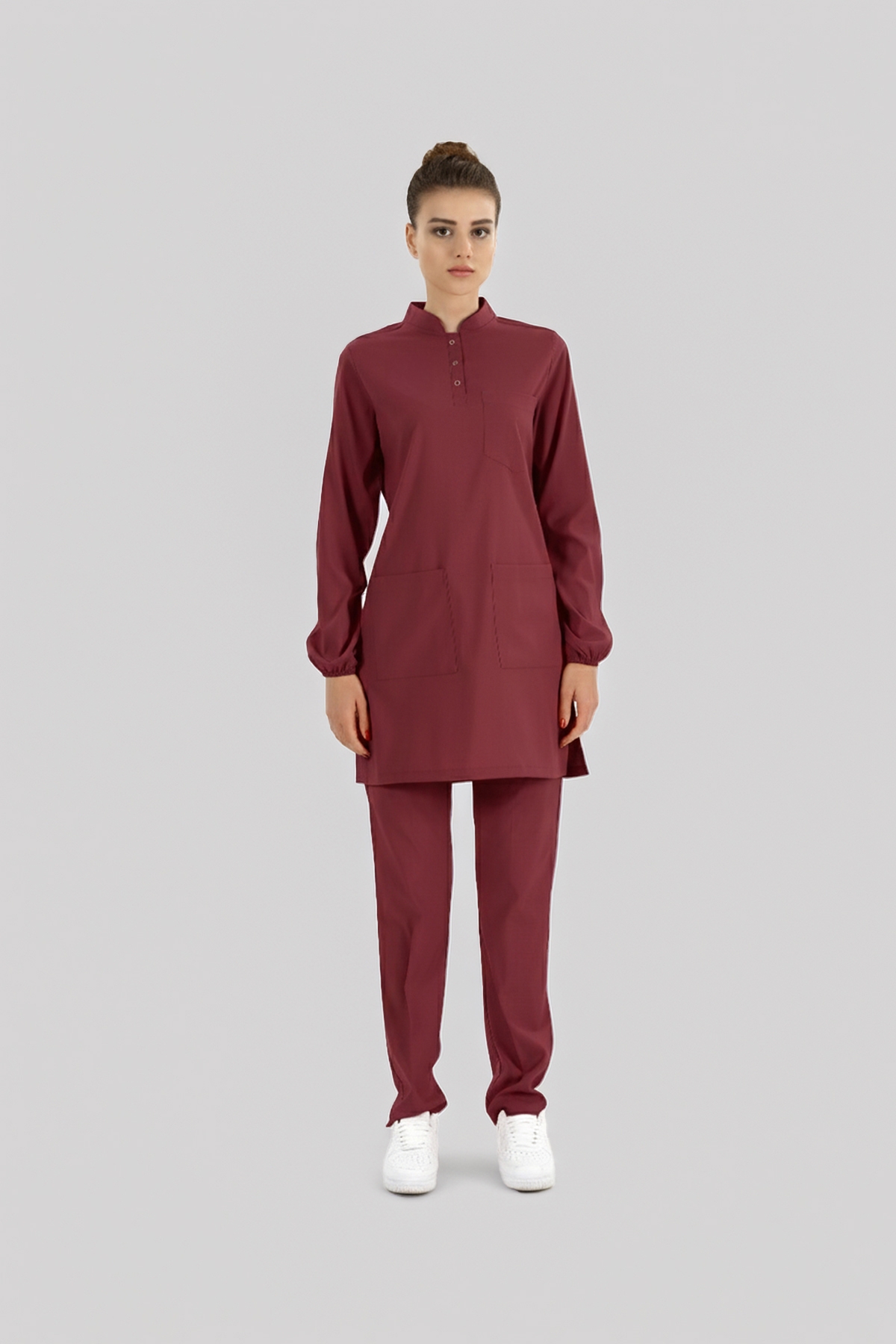 Biking Red Tesettür Hakim Yaka Doktor Hemşire Medikal Scrubs Takım Lüks Likralı Kumaş, tesettürlü sağlık personelleri için özel olarak tasarlanmıştır. Uzun kollu yapısı ve normal cerrahi takımlardan 12 cm daha uzun etek boyu ile tesettür giyim standartlarına uygundur.