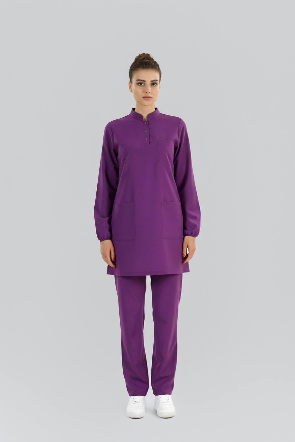 Byzantium Tesettür Hakim Yaka Doktor Hemşire Medikal Scrubs Takım Lüks Likralı Kumaş, tesettürlü sağlık personelleri için özel olarak tasarlanmıştır. Uzun kollu yapısı ve normal cerrahi takımlardan 12 cm daha uzun etek boyu ile tesettür giyim standartlarına uygundur.