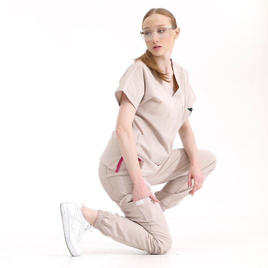 Allgemeine Merkmale des Creme Jogger Medizinischer Scrubs Set für Ärzte und Pflege Luxus Lycra-Stoff