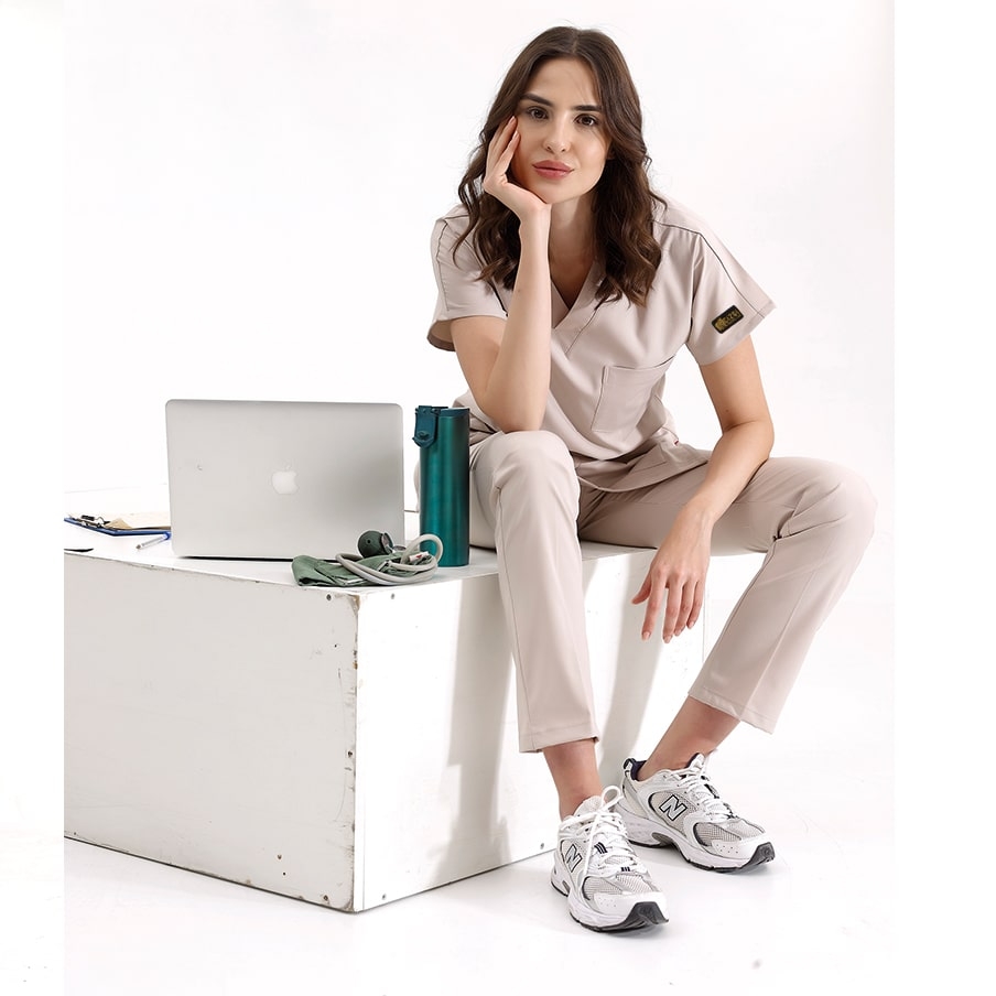 Creme Dr. Greys Medizinischer Scrubs Set für Ärzte und Pflege Luxus Lycra-Stoff
