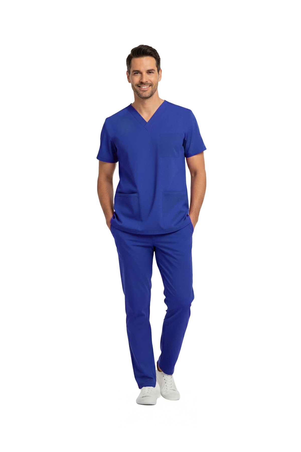 Dazzling Blue Dr. Greys medical scrubs set made from luxury stretch fabric is designed for the comfort of healthcare professionals. The set includes a V-neck top with batwing (Japone) sleeves and elastic-waist pants. Breathable fabric and functional pockets make it ideal for demanding work shifts.