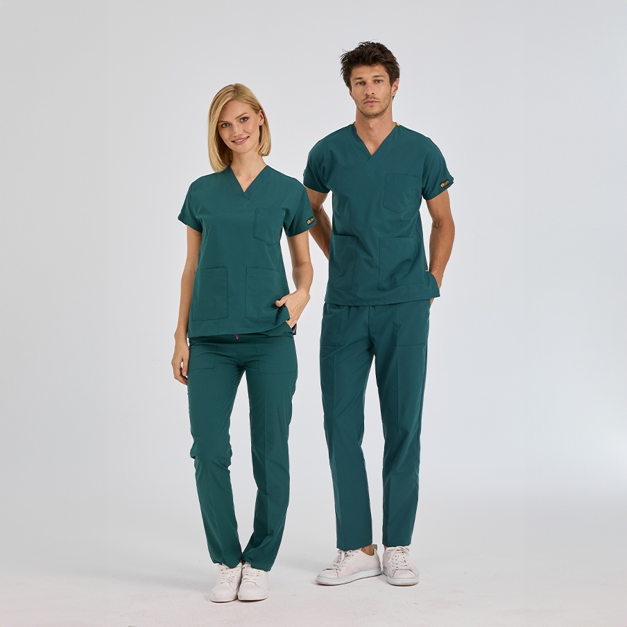 Petrol Yeşili Dr. Greys Doktor Hemşire Medikal Scrubs Takım Terikoton Kumaş, sağlık profesyonellerinin konforu için özel olarak tasarlanmış cerrahi nöbet takımıdır. V yaka, yarasa kol üst ve lastikli bel pantolondan oluşur. Terletmeyen kumaş yapısı ve fonksiyonel cepleri ile yoğun çalışma temposuna uygundur.