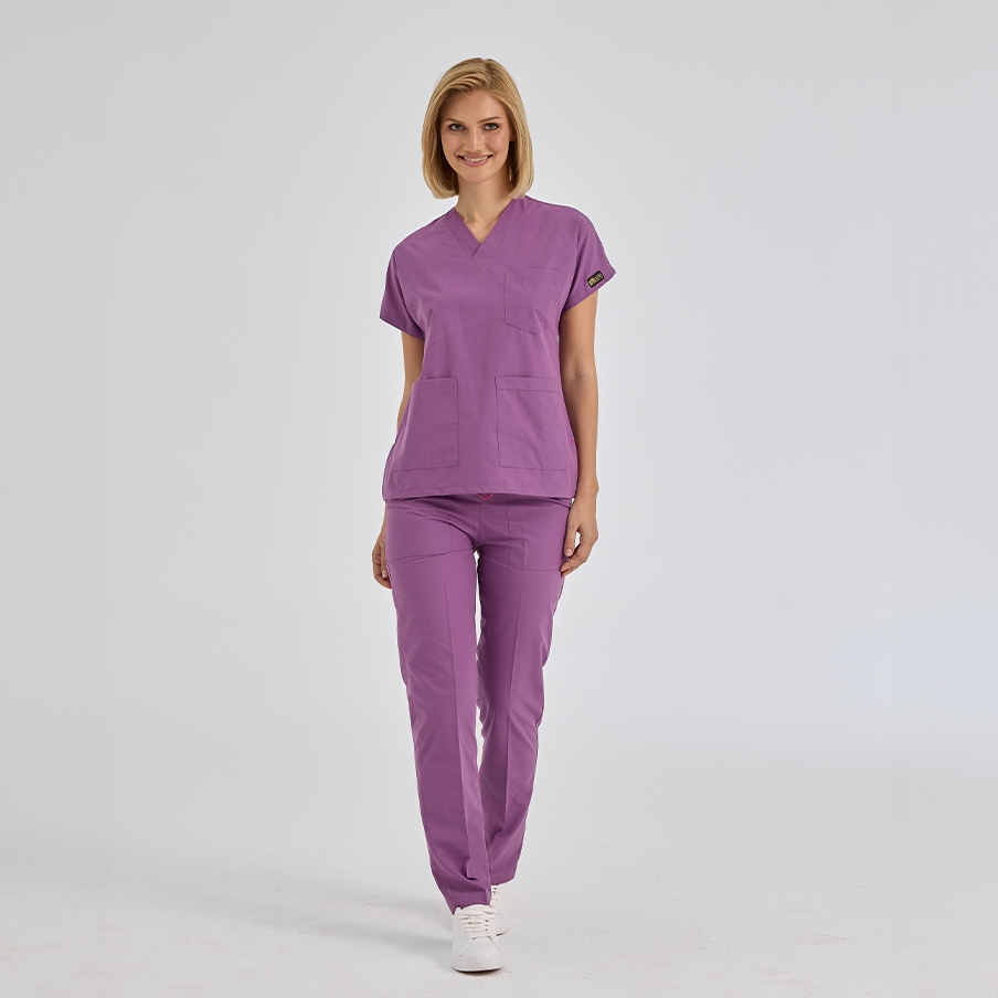 Mor Dr. Greys Doktor Hemşire Medikal Scrubs Takım Terikoton Kumaş, sağlık profesyonellerinin konforu için özel olarak tasarlanmış cerrahi nöbet takımıdır. V yaka, yarasa kol üst ve lastikli bel pantolondan oluşur. Terletmeyen kumaş yapısı ve fonksiyonel cepleri ile yoğun çalışma temposuna uygundur.