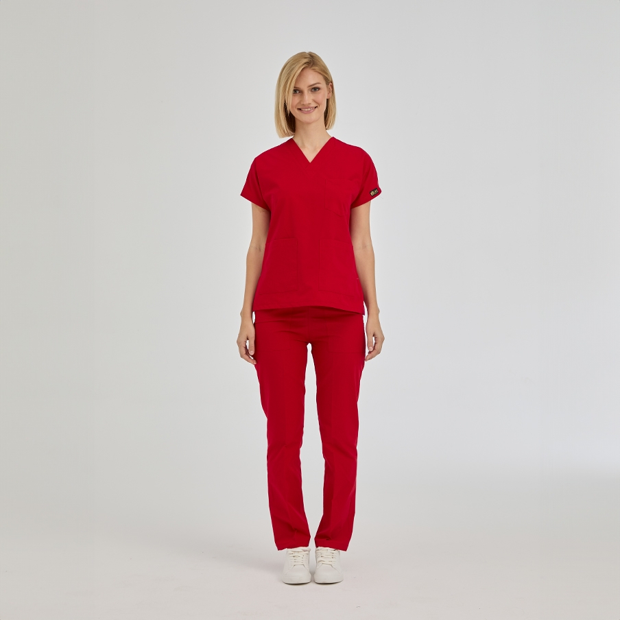 Kırmızı Dr. Greys Doktor Hemşire Medikal Scrubs Takım Terikoton Kumaş, sağlık profesyonellerinin konforu için özel olarak tasarlanmış cerrahi nöbet takımıdır. V yaka, yarasa kol üst ve lastikli bel pantolondan oluşur. Terletmeyen kumaş yapısı ve fonksiyonel cepleri ile yoğun çalışma temposuna uygundur.