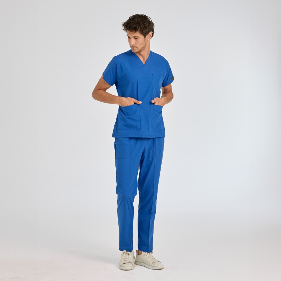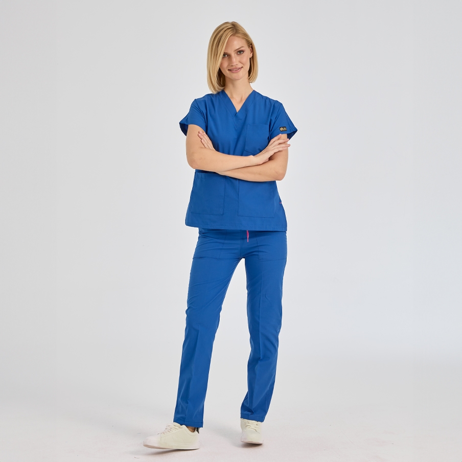 Saks Mavisi Dr. Greys Doktor Hemşire Medikal Scrubs Takım Terikoton Kumaş, sağlık profesyonellerinin konforu için özel olarak tasarlanmış cerrahi nöbet takımıdır. V yaka, yarasa kol üst ve lastikli bel pantolondan oluşur. Terletmeyen kumaş yapısı ve fonksiyonel cepleri ile yoğun çalışma temposuna uygundur.