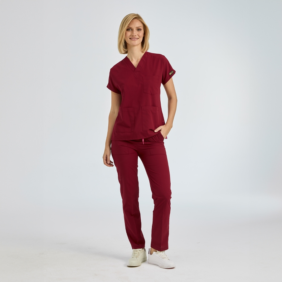 Bordo Dr. Greys Doktor Hemşire Medikal Scrubs Takım Terikoton Kumaş, sağlık profesyonellerinin konforu için özel olarak tasarlanmış cerrahi nöbet takımıdır. V yaka, yarasa kol üst ve lastikli bel pantolondan oluşur. Terletmeyen kumaş yapısı ve fonksiyonel cepleri ile yoğun çalışma temposuna uygundur.