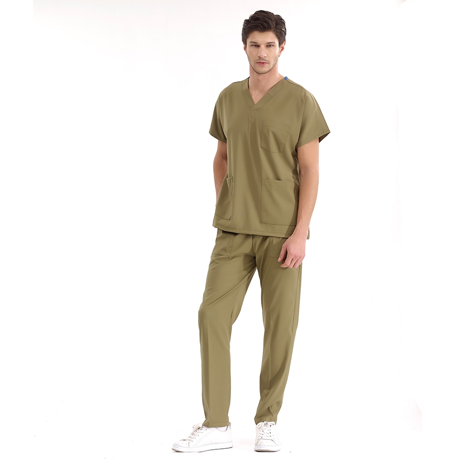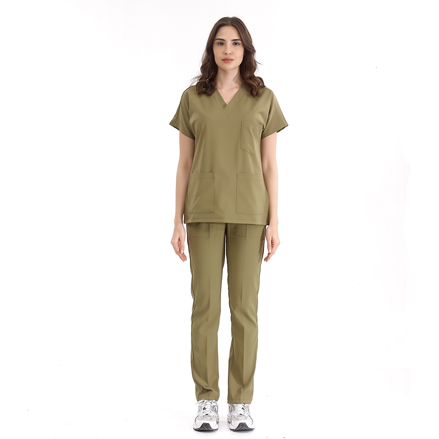 Haki Dr. Greys Doktor Hemşire Medikal Scrubs Takım Lüks Likralı Kumaş, sağlık profesyonellerinin konforu için özel olarak tasarlanmış cerrahi nöbet takımıdır. V yaka, yarasa kol üst ve lastikli bel pantolondan oluşur. Terletmeyen kumaş yapısı ve fonksiyonel cepleri ile yoğun çalışma temposuna uygundur.