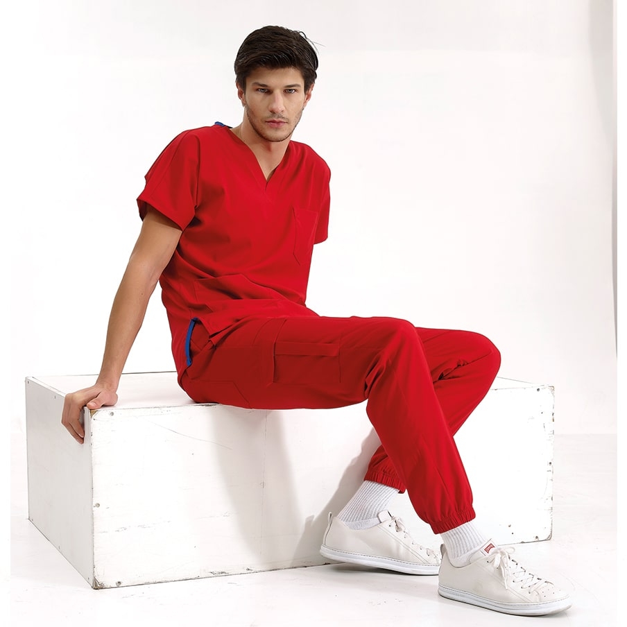 Kırmızı Jogger Doktor Hemşire Medikal Scrubs Takım Lüks Likralı Kumaş, sağlık çalışanlarının rahatlığı ve şıklığı için tasarlanmış V yaka ve jogger pantolonlu cerrahi takımdır. Kargo cep detayı ve lastikli paçaları ile fonksiyonel kullanım sağlar.