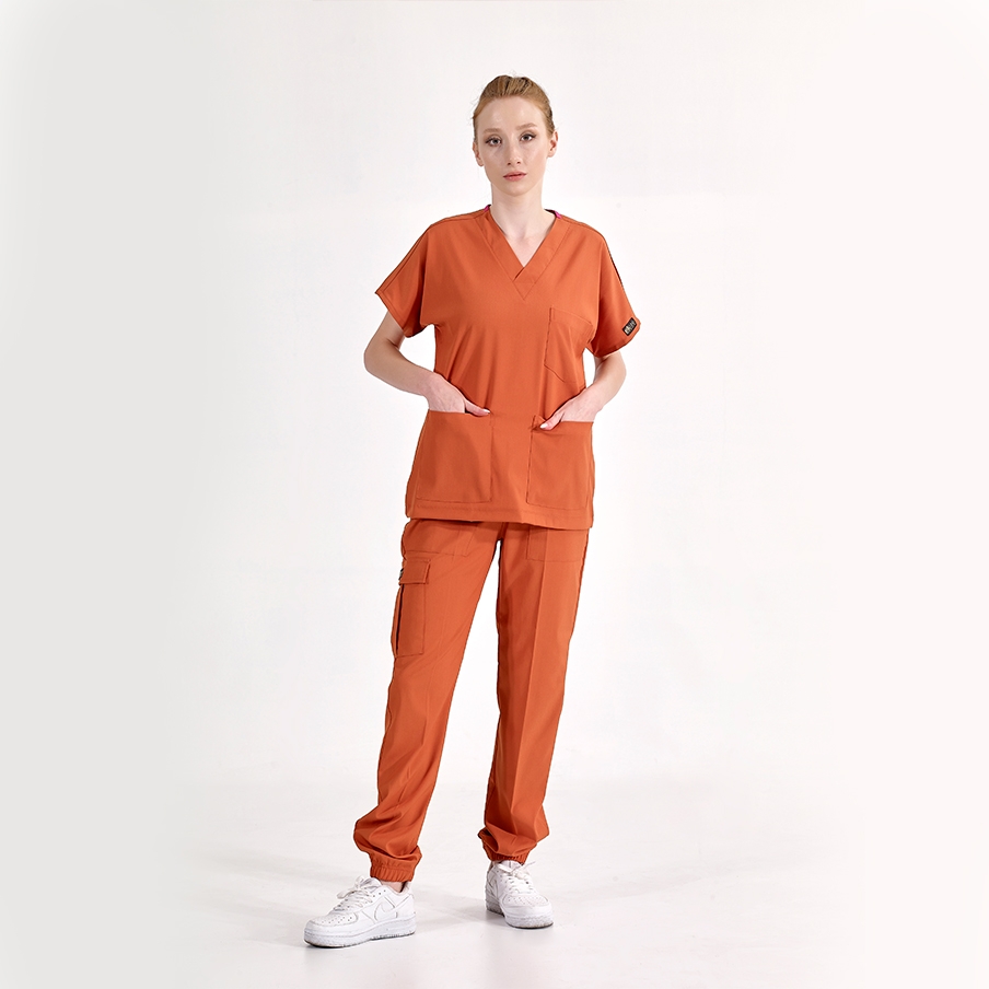 Kiremit Jogger Doktor Hemşire Medikal Scrubs Takım Lüks Likralı Kumaş, sağlık çalışanlarının rahatlığı ve şıklığı için tasarlanmış V yaka ve jogger pantolonlu cerrahi takımdır. Kargo cep detayı ve lastikli paçaları ile fonksiyonel kullanım sağlar.
