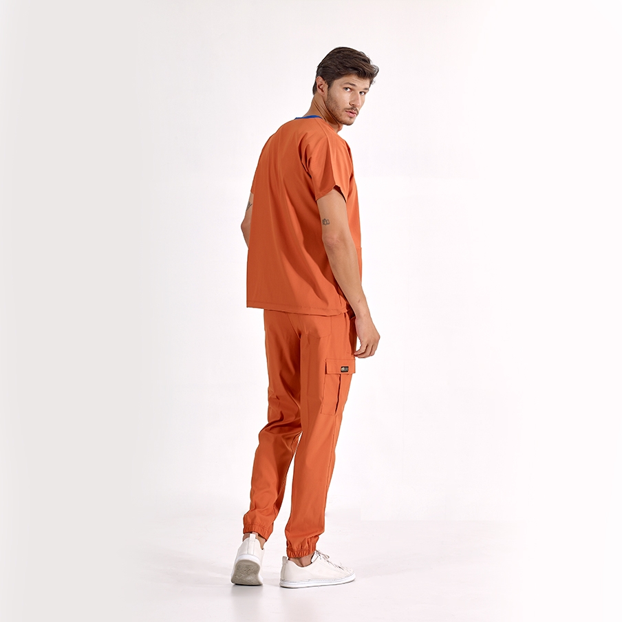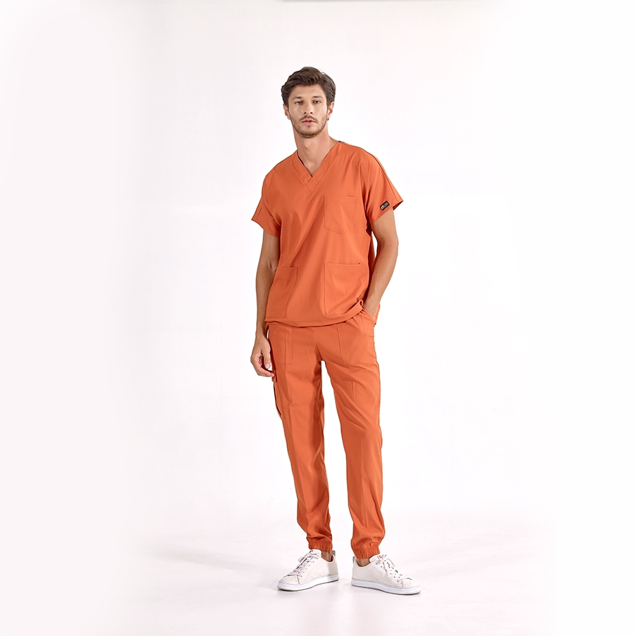 Kiremit Jogger Doktor Hemşire Medikal Scrubs Takım Lüks Likralı Kumaş, sağlık çalışanlarının rahatlığı ve şıklığı için tasarlanmış V yaka ve jogger pantolonlu cerrahi takımdır. Kargo cep detayı ve lastikli paçaları ile fonksiyonel kullanım sağlar.