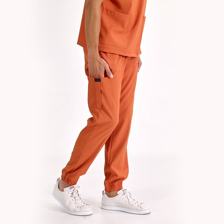 Кирпичный Медицинский Костюм Jogger для Врачей и Медсестер Ткань Люкс Лайкра — это хирургический комплект с V-образным вырезом и брюками-джоггерами, разработанный для комфорта и элегантности медицинских работников. Обеспечивает функциональность благодаря детали кармана карго и эластичным манжетам.