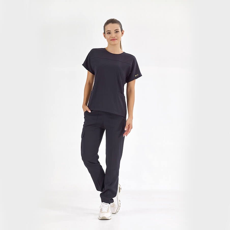 Lacivert Basic Doktor Hemşire Medikal Scrubs Takım Lüks Likralı Kumaş, sağlık çalışanlarının rahatlığı ve şıklığı için tasarlanmış bisiklet yaka ve jogger pantolonlu cerrahi takımdır. Spor dikişleri ve kargo cep detayıyla fonksiyonel kullanım sağlar.