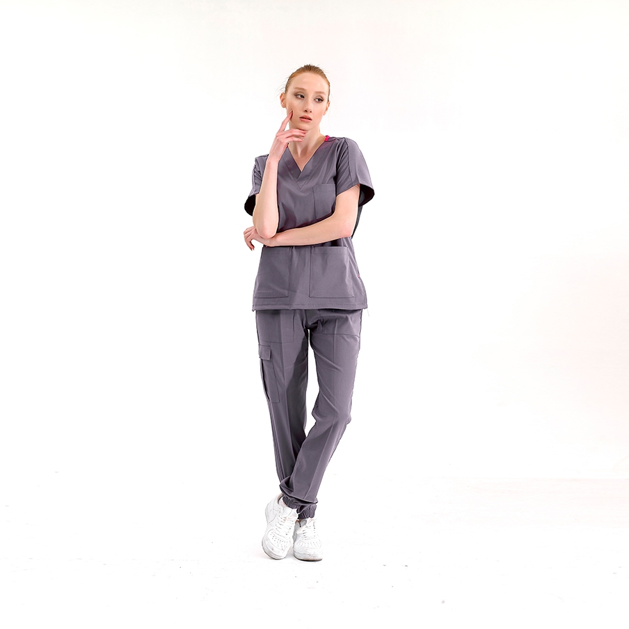 Kurşuni Gri Jogger Doktor Hemşire Medikal Scrubs Takım Lüks Likralı Kumaş, sağlık çalışanlarının rahatlığı ve şıklığı için tasarlanmış V yaka ve jogger pantolonlu cerrahi takımdır. Kargo cep detayı ve lastikli paçaları ile fonksiyonel kullanım sağlar.