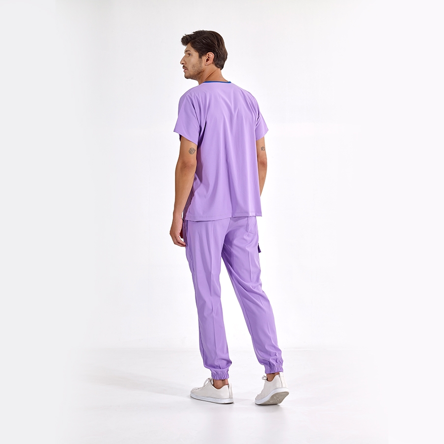 Lilac Jogger Doctor Nurse Medical Scrubs Set Luxury Lycra Fabric is a V-neck and jogger pants surgical set designed for the comfort and elegance of healthcare professionals. It provides functional use with its cargo pocket detail and elastic hems.