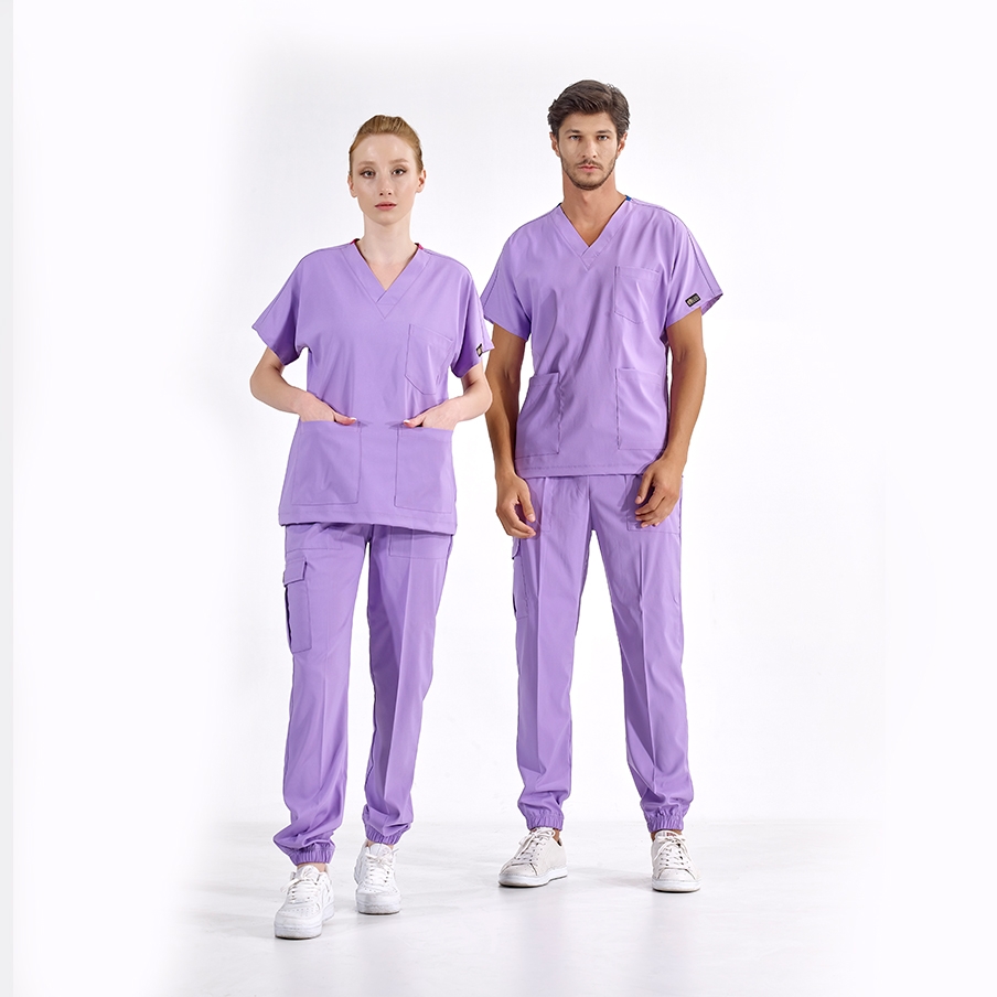 Лиловый Медицинский Костюм Jogger для Врачей и Медсестер Ткань Люкс Лайкра — это хирургический комплект с V-образным вырезом и брюками-джоггерами, разработанный для комфорта и элегантности медицинских работников. Обеспечивает функциональность благодаря детали кармана карго и эластичным манжетам.