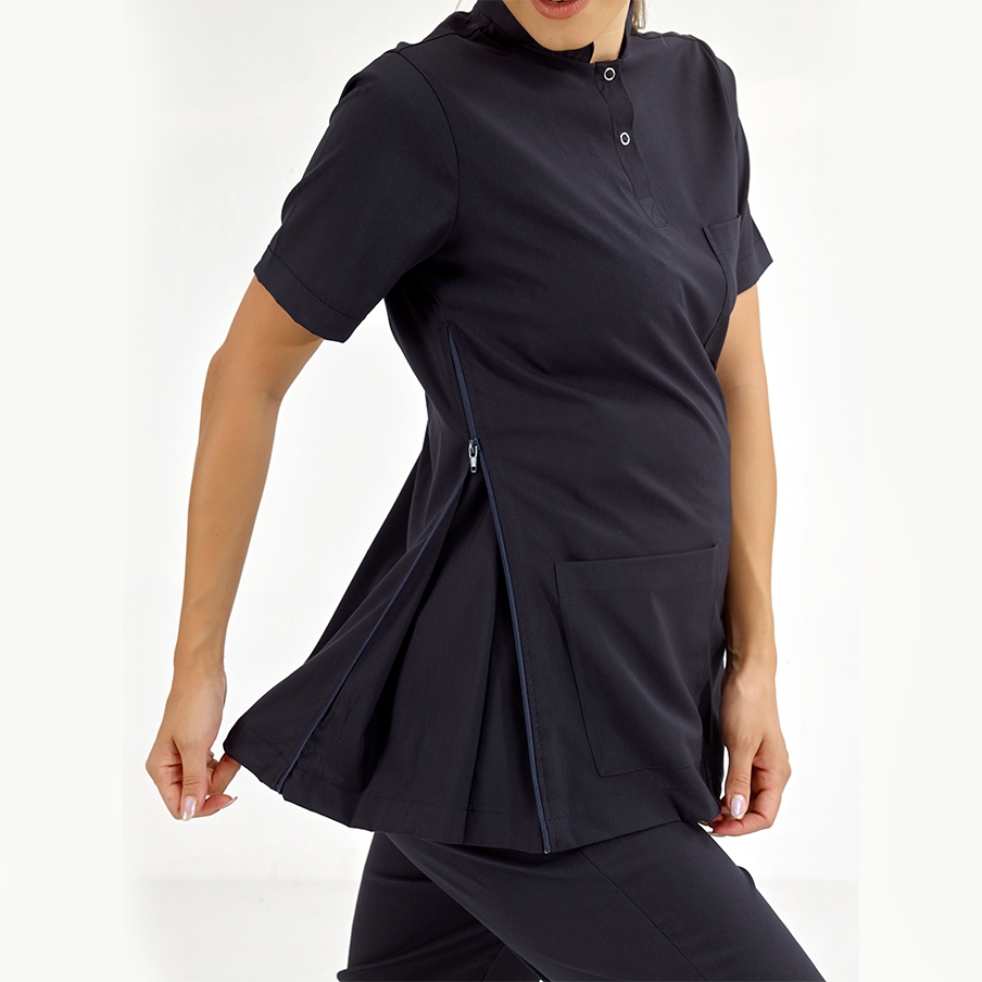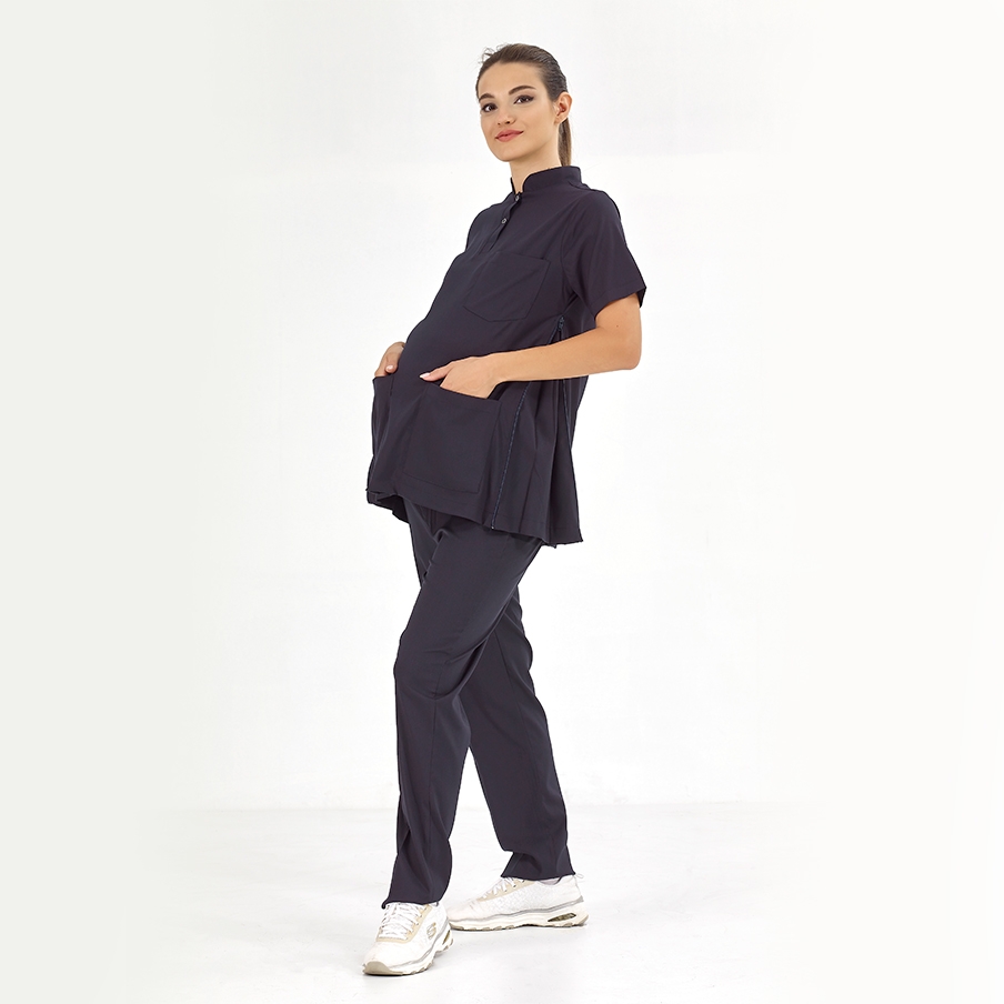 Lacivert Hamile Doktor Hemşire Medikal Scrubs Takım Lüks Likralı Kumaş, hamilelik dönemindeki sağlık çalışanları için özel olarak tasarlanmıştır. Ayarlanabilir bel lastiği ve üst bedendeki yan fermuarlar sayesinde karın büyümesine uyum sağlar ve hamileliğin başından sonuna kadar rahatlıkla kullanılabilir.