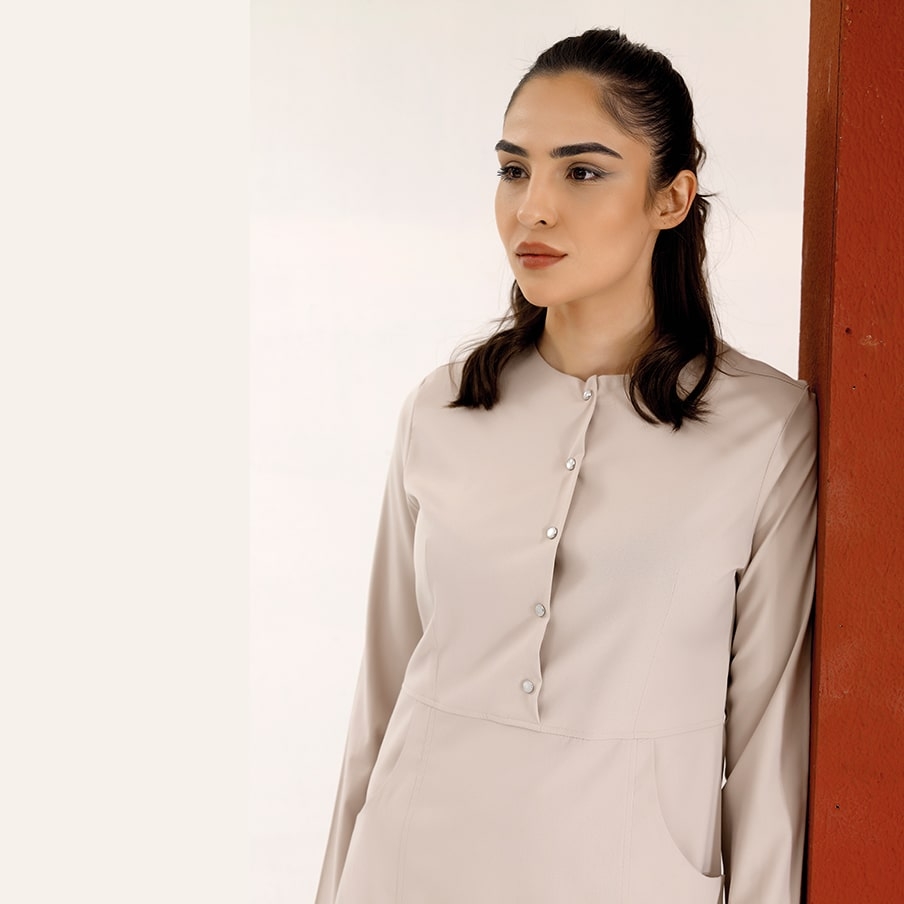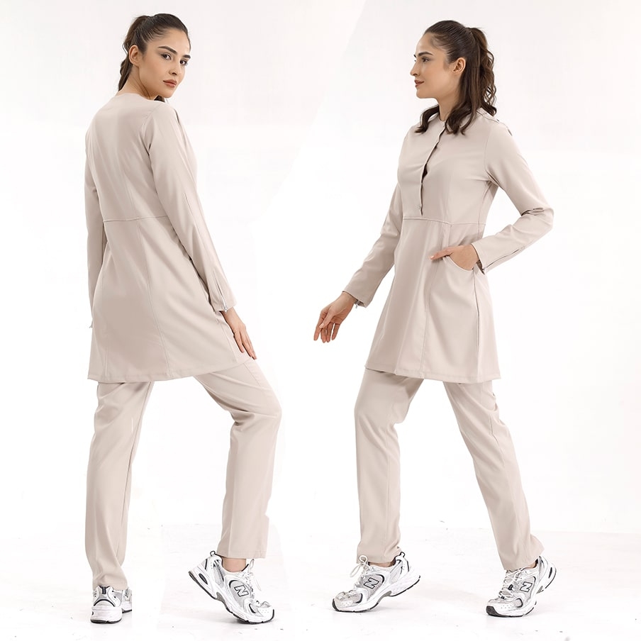 Krem Fermuarlı Tesettür Doktor Hemşire Medikal Scrubs Takım Lüks Likralı Kumaş, tesettürlü sağlık personelleri için özel olarak tasarlanmıştır. Uzun kollu yapısı, normal cerrahi takımlardan 12 cm daha uzun etek boyu ve kol uçlarındaki fermuarlar ile kullanım kolaylığı sağlar.