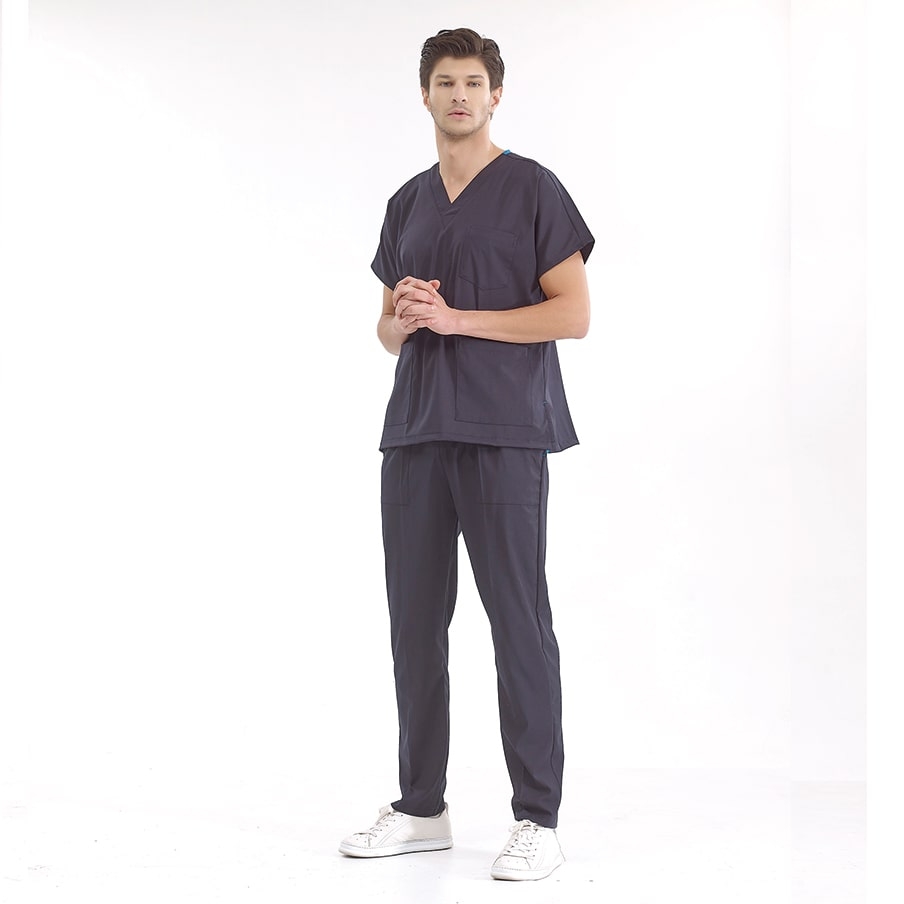 Lacivert Dr. Greys Doktor Hemşire Medikal Scrubs Takım Lüks Likralı Kumaş, sağlık profesyonellerinin konforu için özel olarak tasarlanmış cerrahi nöbet takımıdır. V yaka, yarasa kol üst ve lastikli bel pantolondan oluşur. Terletmeyen kumaş yapısı ve fonksiyonel cepleri ile yoğun çalışma temposuna uygundur.