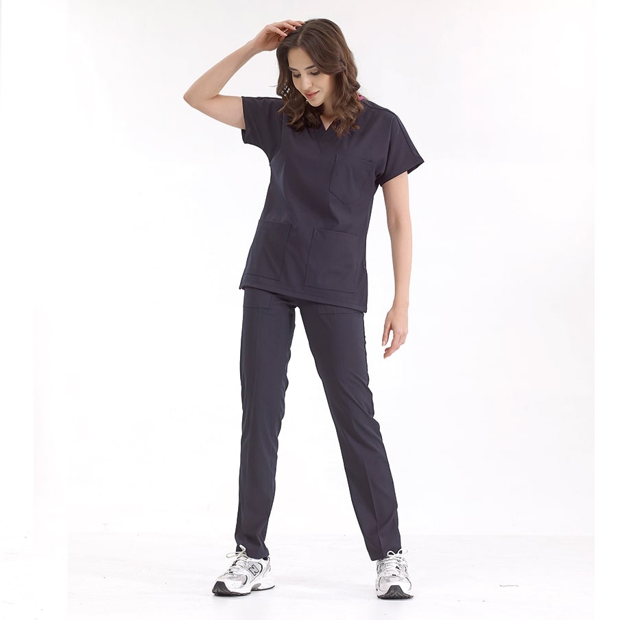 Lacivert Dr. Greys Doktor Hemşire Medikal Scrubs Takım Lüks Likralı Kumaş, sağlık profesyonellerinin konforu için özel olarak tasarlanmış cerrahi nöbet takımıdır. V yaka, yarasa kol üst ve lastikli bel pantolondan oluşur. Terletmeyen kumaş yapısı ve fonksiyonel cepleri ile yoğun çalışma temposuna uygundur.