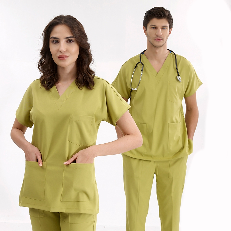 Antep Fıstığı Dr. Greys Doktor Hemşire Medikal Scrubs Takım Lüks Likralı Kumaş, sağlık profesyonellerinin konforu için özel olarak tasarlanmış cerrahi nöbet takımıdır. V yaka, yarasa kol üst ve lastikli bel pantolondan oluşur. Terletmeyen kumaş yapısı ve fonksiyonel cepleri ile yoğun çalışma temposuna uygundur.