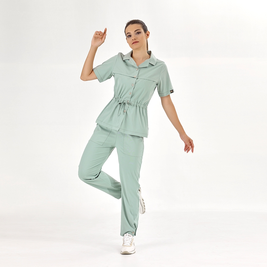 Mint Yeşili Retro Kadın Doktor Hemşire Medikal Scrubs Takım Lüks Likralı Kumaş, kadın sağlık çalışanlarının şıklığı ve rahatlığı için tasarlanmış klasik yaka ve önden düğmeli cerrahi takımdır. Beldeki büzgü detayı ve paça tasarımıyla zarif bir görünüm sunar.