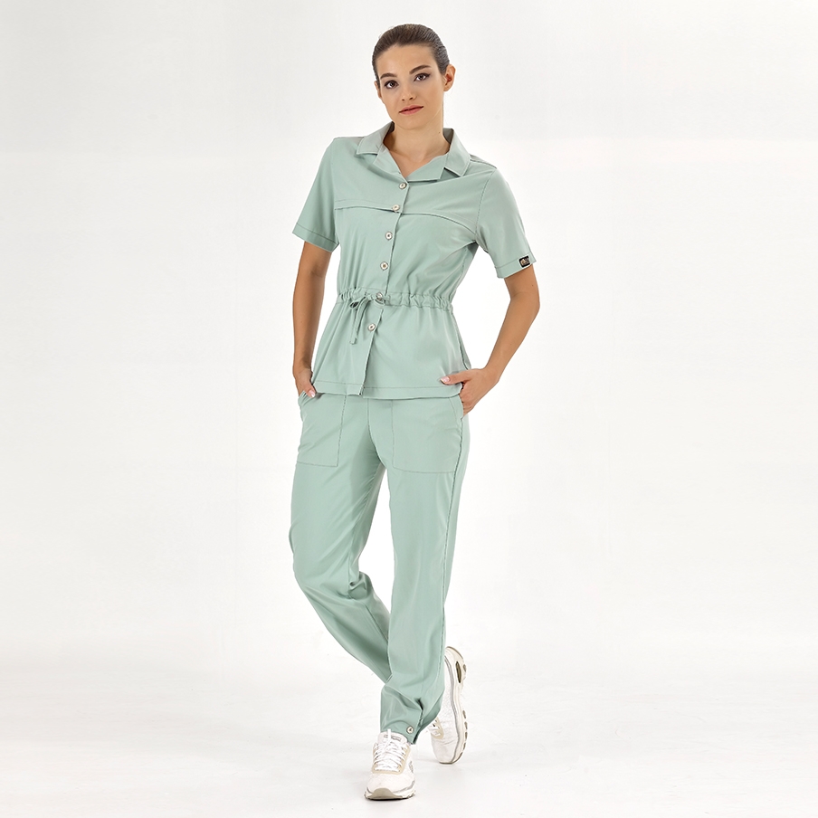 Mint Yeşili Retro Kadın Doktor Hemşire Medikal Scrubs Takım Lüks Likralı Kumaş, kadın sağlık çalışanlarının şıklığı ve rahatlığı için tasarlanmış klasik yaka ve önden düğmeli cerrahi takımdır. Beldeki büzgü detayı ve paça tasarımıyla zarif bir görünüm sunar.