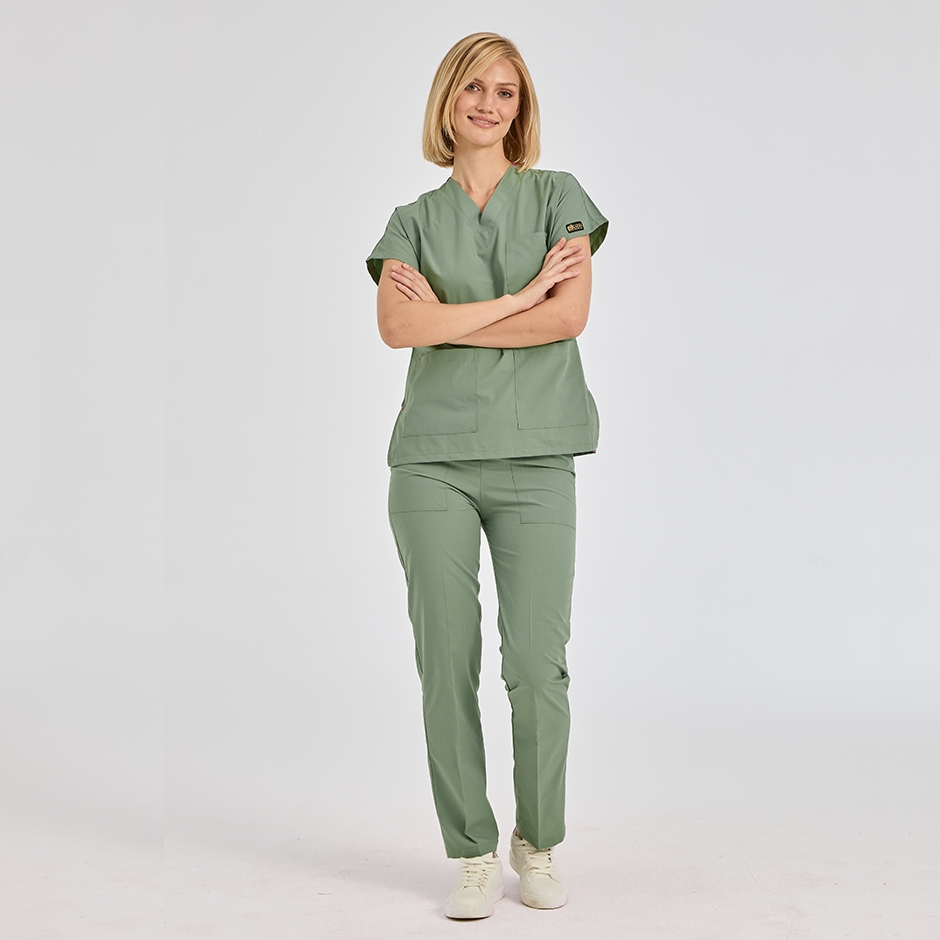 Sage Green Dr. Greys Doctor Nurse Medical Scrubs Set Poly‑cotton blend fabric is a surgical scrub set specially designed for the comfort of healthcare professionals. It consists of a V-neck, batwing sleeve top and elastic waist pants. It is suitable for intense work tempos with its non-sweating fabric structure and functional pockets.