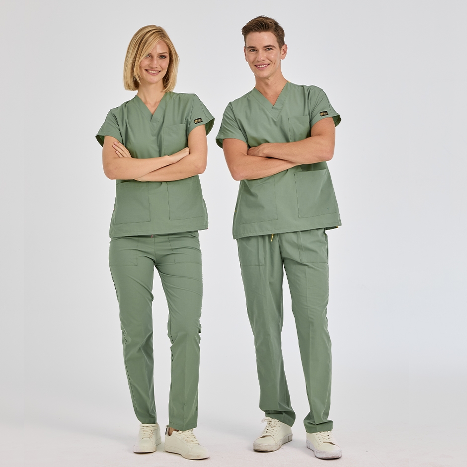 Sage Green Dr. Greys Doctor Nurse Medical Scrubs Set Poly‑cotton blend fabric is a surgical scrub set specially designed for the comfort of healthcare professionals. It consists of a V-neck, batwing sleeve top and elastic waist pants. It is suitable for intense work tempos with its non-sweating fabric structure and functional pockets.