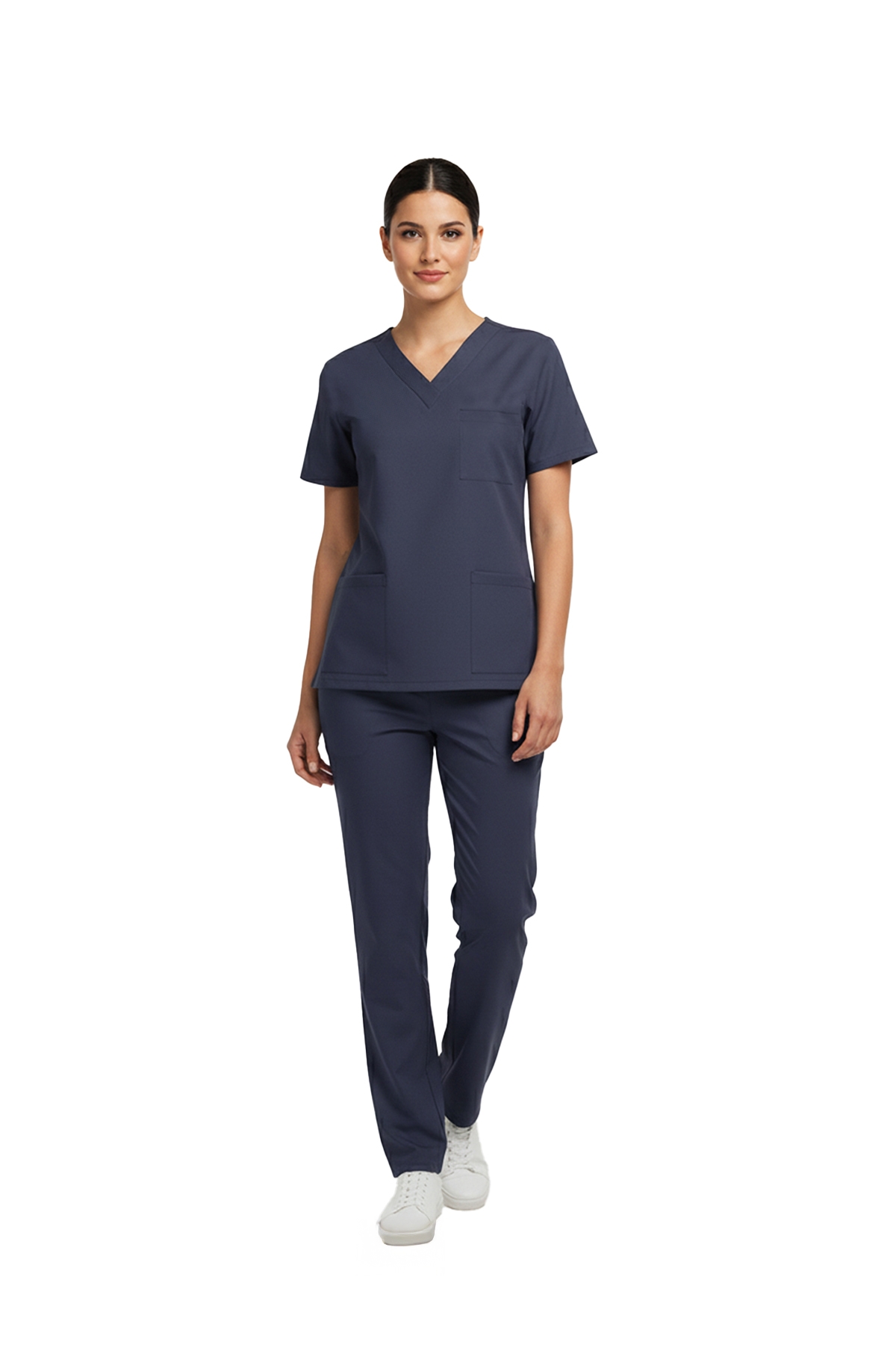 Patriot Blue Dr. Greys medical scrubs set made from luxury stretch fabric is designed for the comfort of healthcare professionals. The set includes a V-neck top with batwing (Japone) sleeves and elastic-waist pants. Breathable fabric and functional pockets make it ideal for demanding work shifts.