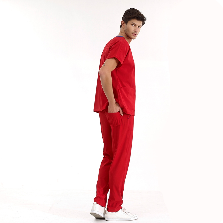 Red Dr. Greys Doctor Nurse Medical Scrubs Set Luxury Lycra Fabric is a surgical scrub set specially designed for the comfort of healthcare professionals. It consists of a V-neck, batwing sleeve top and elastic waist pants. It is suitable for intense work tempos with its non-sweating fabric structure and functional pockets.