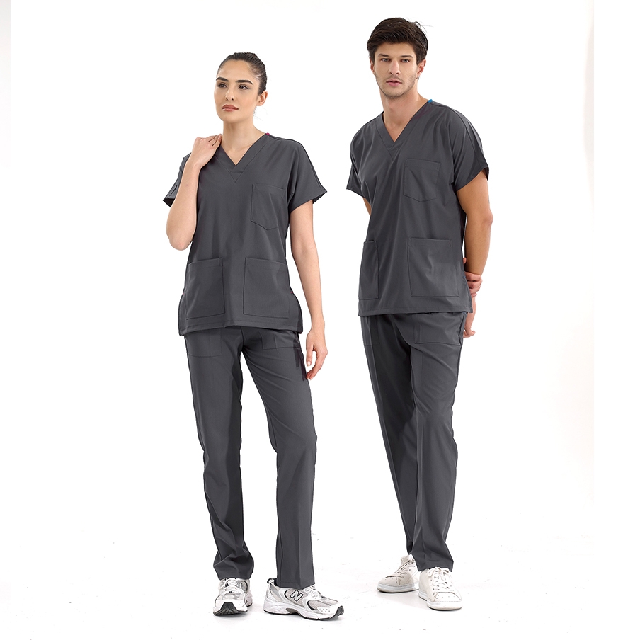 Charcoal Gray Dr. Greys Doctor Nurse Medical Scrubs Set Luxury Lycra Fabric is a surgical scrub set specially designed for the comfort of healthcare professionals. It consists of a V-neck, batwing sleeve top and elastic waist pants. It is suitable for intense work tempos with its non-sweating fabric structure and functional pockets.