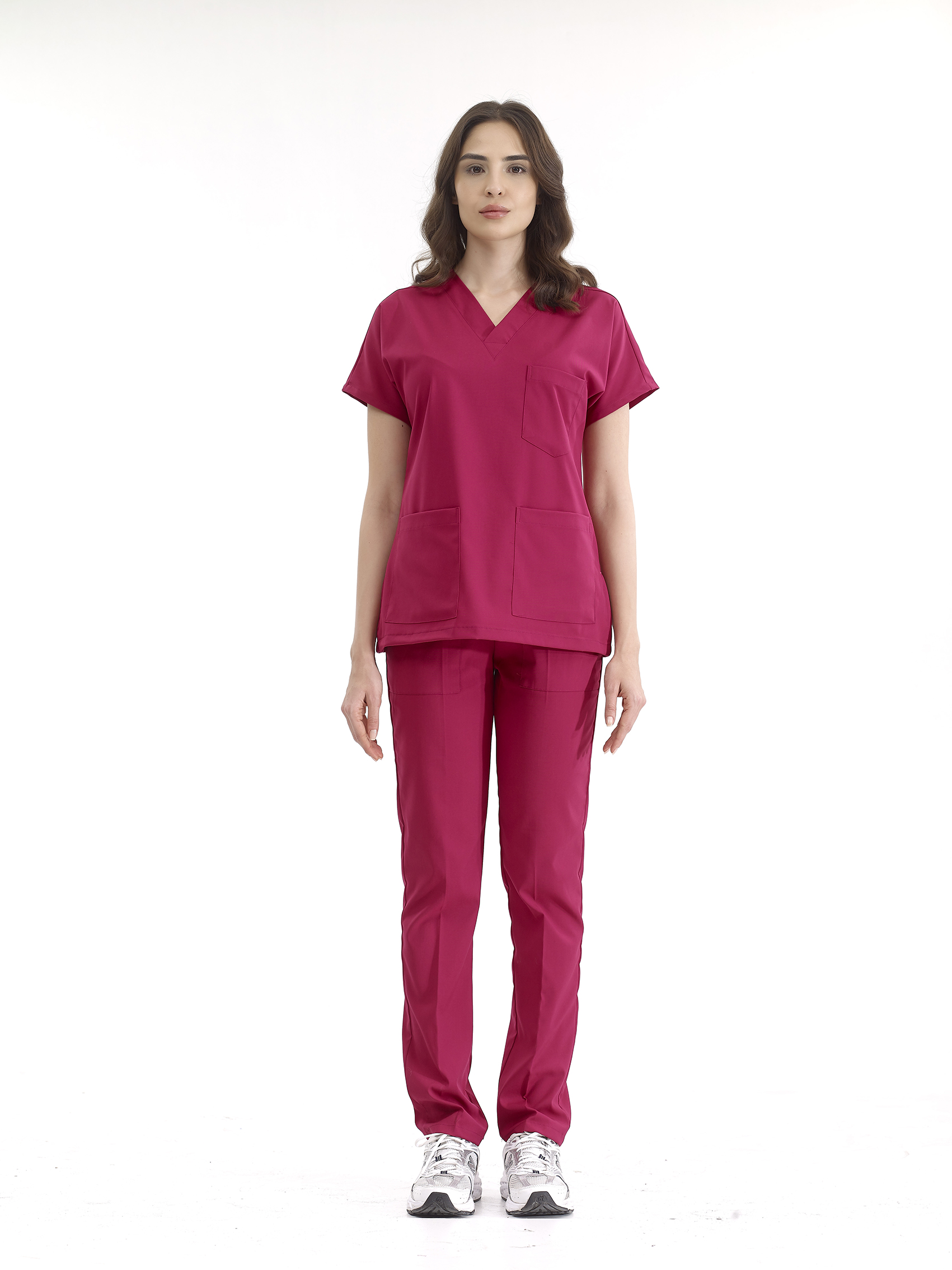 Cherry Red Dr. Greys Doctor Nurse Medical Scrubs Set Luxury Lycra Fabric is a surgical scrub set specially designed for the comfort of healthcare professionals. It consists of a V-neck, batwing sleeve top and elastic waist pants. It is suitable for intense work tempos with its non-sweating fabric structure and functional pockets.