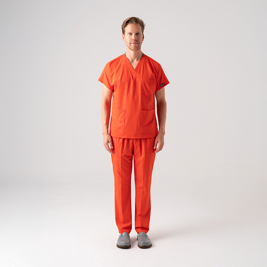 Turunç Dr. Greys Doktor Hemşire Medikal Scrubs Takım Best Likralı Kumaş, sağlık profesyonellerinin konforu için özel olarak tasarlanmış cerrahi nöbet takımıdır. V yaka, yarasa kol üst ve lastikli bel pantolondan oluşur. Terletmeyen kumaş yapısı ve fonksiyonel cepleri ile yoğun çalışma temposuna uygundur.