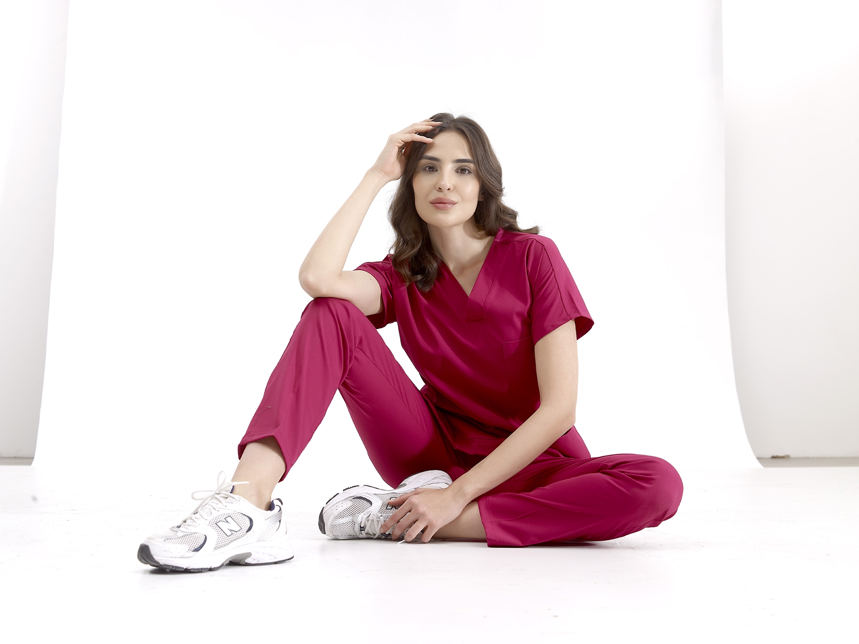 Вишневый Dr. Greys Медицинский Костюм (Хирургический) для Врачей и Медсестер Ткань Люкс Лайкра — это хирургический комплект, специально разработанный для комфорта медицинских работников. Состоит из верха с V-образным вырезу и рукавами "летучая мышь", а также брюк на эластичном поясе. Подходит для интенсивного темпа работы благодаря не потеющей ткани и функциональным карманам.