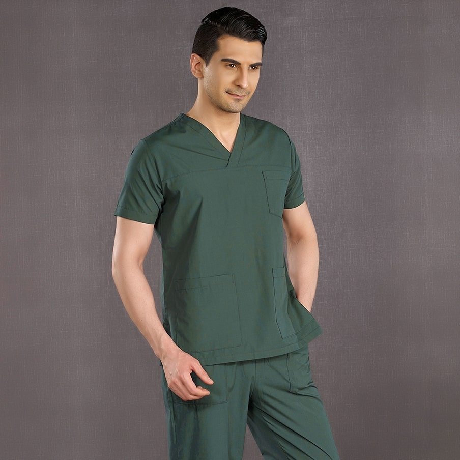 Avcı Yeşili Klasik Doktor Hemşire Medikal Scrubs Takım Terikoton Kumaş, sağlık çalışanlarının rahatlığı için tasarlanmış V yaka ve takma kollu cerrahi takımdır. Yırtmaçlı üst ve klasik kesim pantolonu ile gün boyu konfor sağlar.