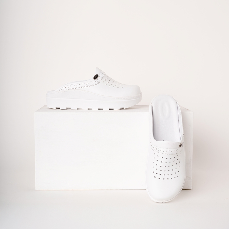 Белый Женские Доктор Медсестра Медицинские Сабо Gold Fit из Натуральной Кожи — это специально разработанные медицинские сабо из 100% натуральной кожи для медицинских работников. Они обеспечивают комфорт и эстетику благодаря специально изготовленной подошве и тиснению золотым узором.