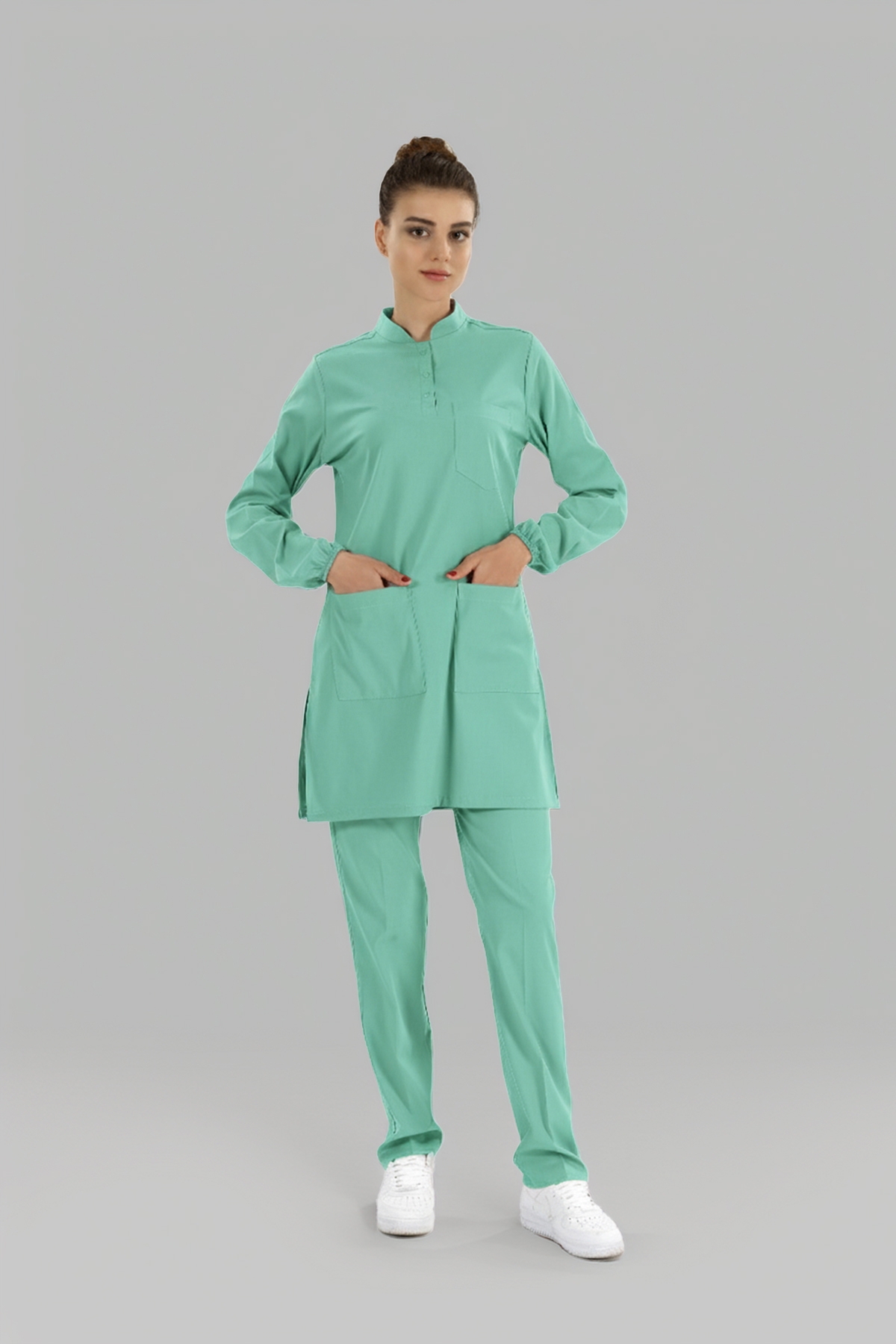 Bermuda Tesettür Hakim Yaka Doktor Hemşire Medikal Scrubs Takım Lüks Likralı Kumaş, tesettürlü sağlık personelleri için özel olarak tasarlanmıştır. Uzun kollu yapısı ve normal cerrahi takımlardan 12 cm daha uzun etek boyu ile tesettür giyim standartlarına uygundur.