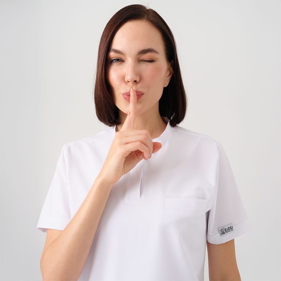 Beyaz Cool Doktor Hemşire Medikal Scrubs Takım Best Likralı Kumaş, sağlık çalışanlarının rahatlığı ve şıklığı için tasarlanmış gizli patlı ve bisiklet yaka cerrahi takımdır. Asimetrik cep yerleşimi ve modern tasarımıyla fark yaratır.