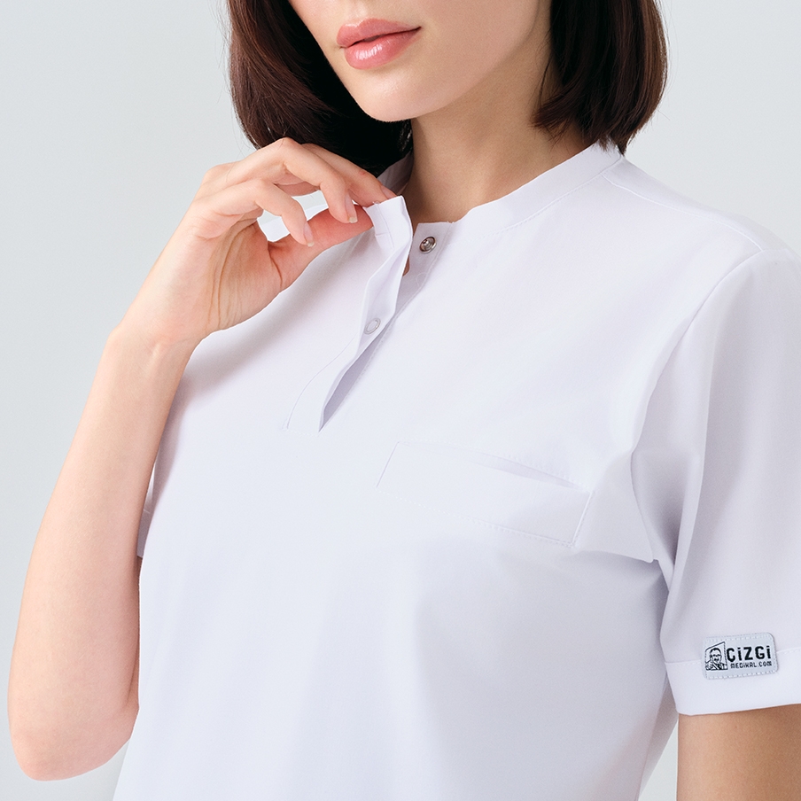 Beyaz Cool Doktor Hemşire Medikal Scrubs Takım Best Likralı Kumaş, sağlık çalışanlarının rahatlığı ve şıklığı için tasarlanmış gizli patlı ve bisiklet yaka cerrahi takımdır. Asimetrik cep yerleşimi ve modern tasarımıyla fark yaratır.