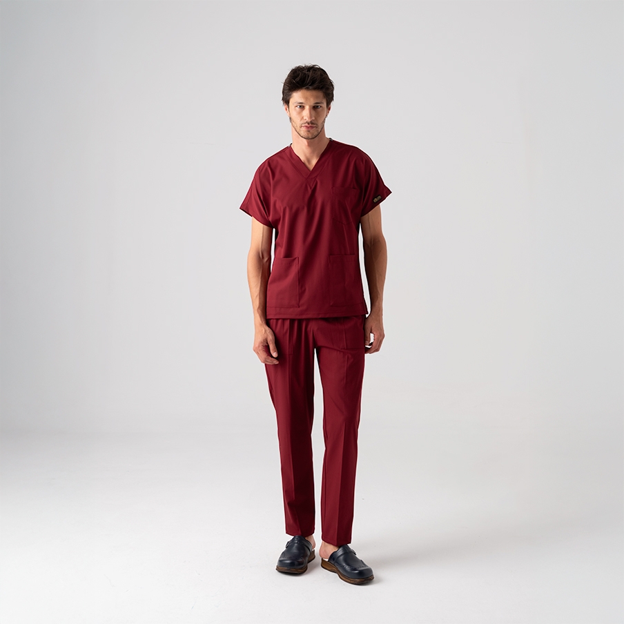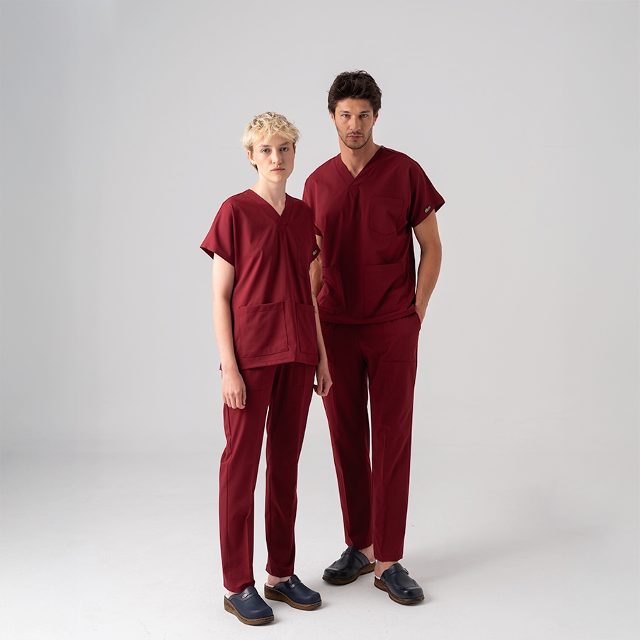 Burgundy Dr. Greys Doctor Nurse Medical Scrubs Set Best Lycra Fabric is a surgical scrub set specially designed for the comfort of healthcare professionals. It consists of a V-neck, batwing sleeve top and elastic waist pants. It is suitable for intense work tempos with its non-sweating fabric structure and functional pockets.