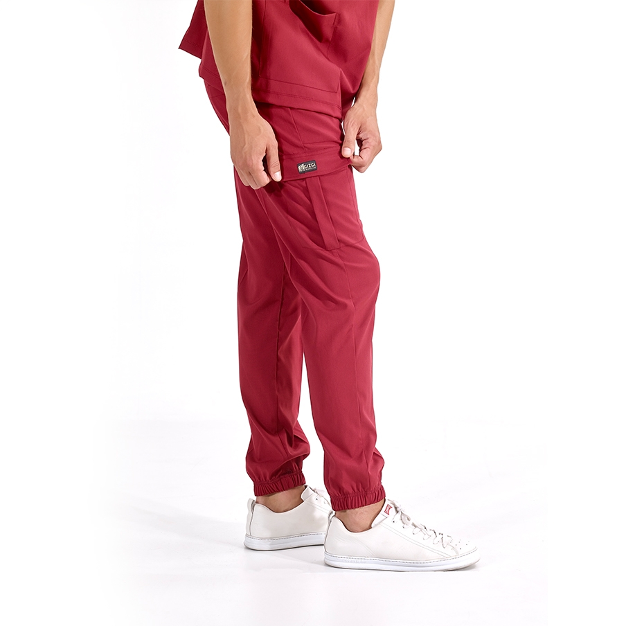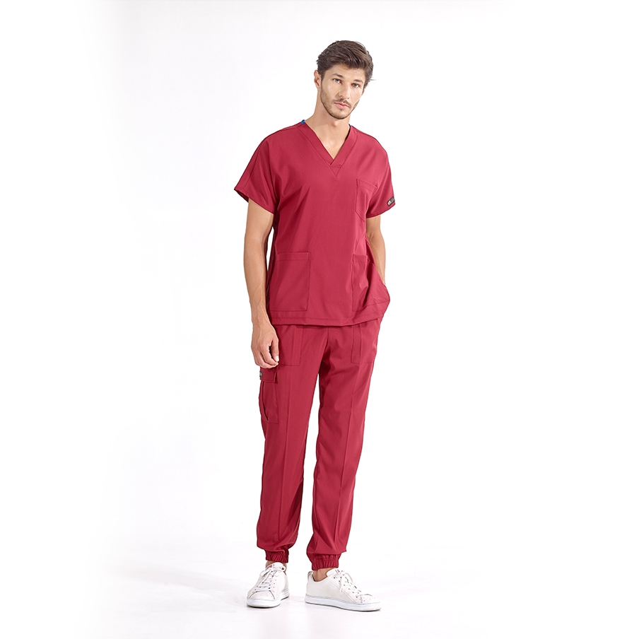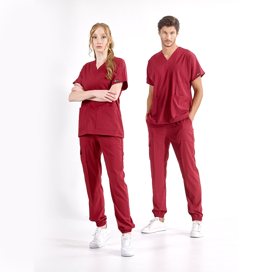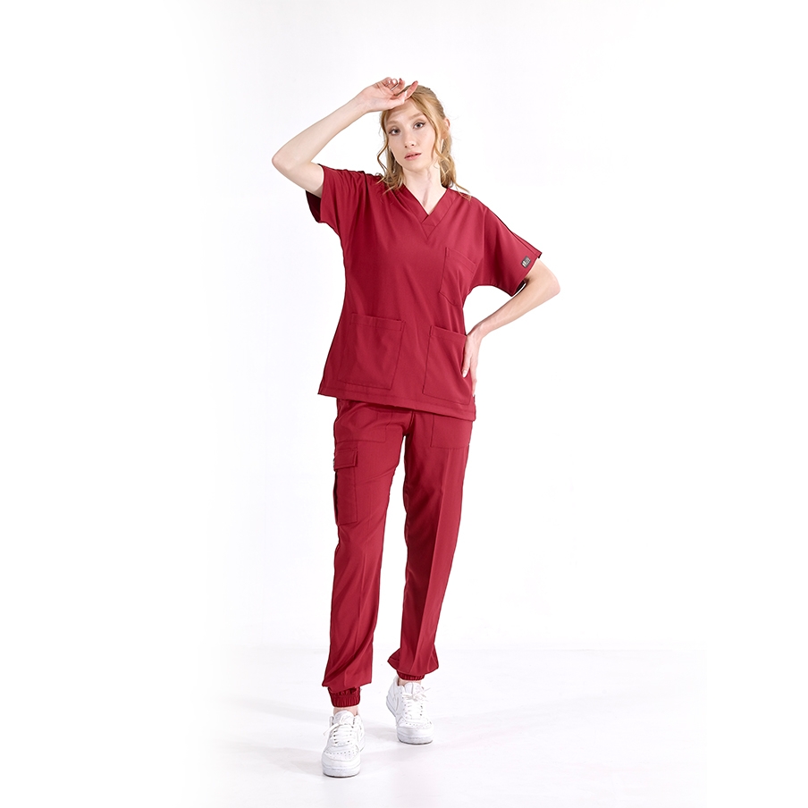 Bordo Jogger Doktor Hemşire Medikal Scrubs Takım Lüks Likralı Kumaş, sağlık çalışanlarının rahatlığı ve şıklığı için tasarlanmış V yaka ve jogger pantolonlu cerrahi takımdır. Kargo cep detayı ve lastikli paçaları ile fonksiyonel kullanım sağlar.