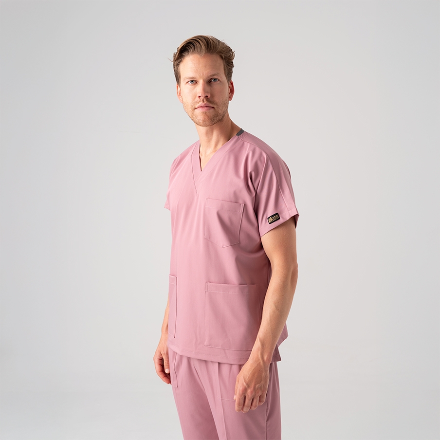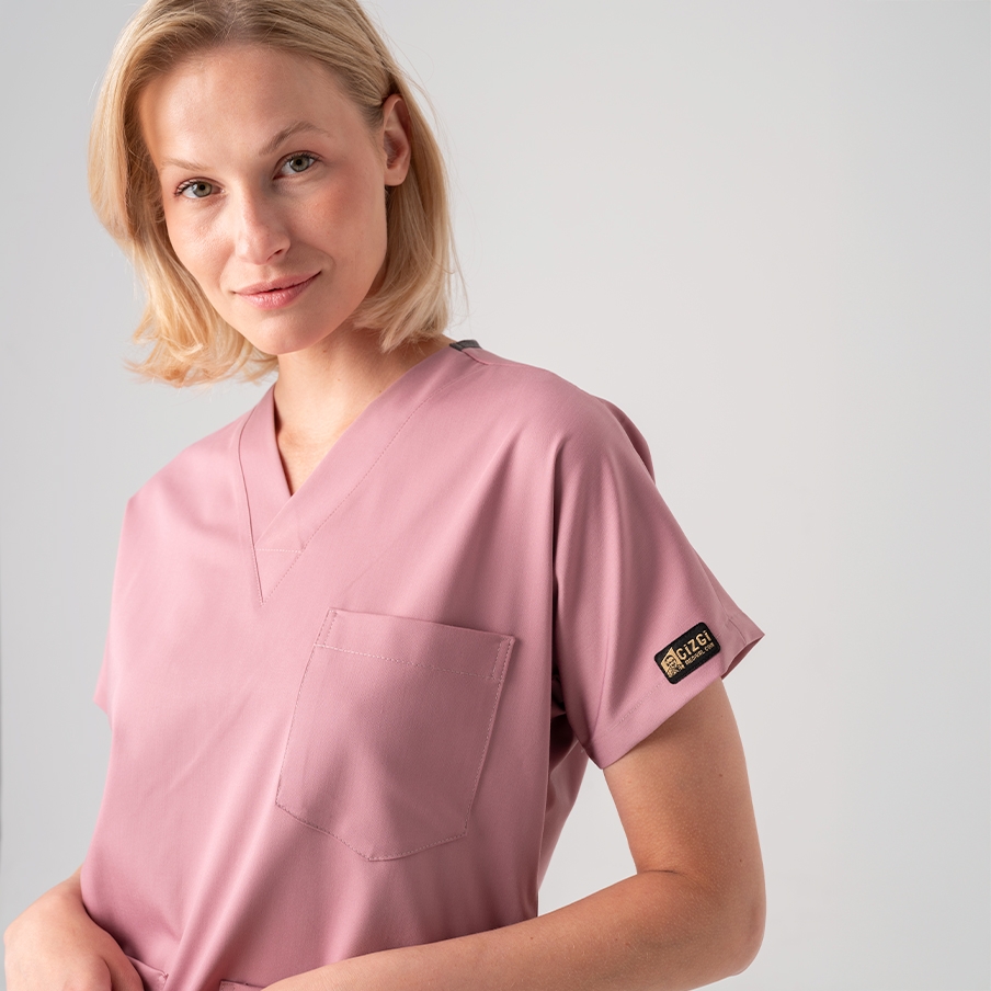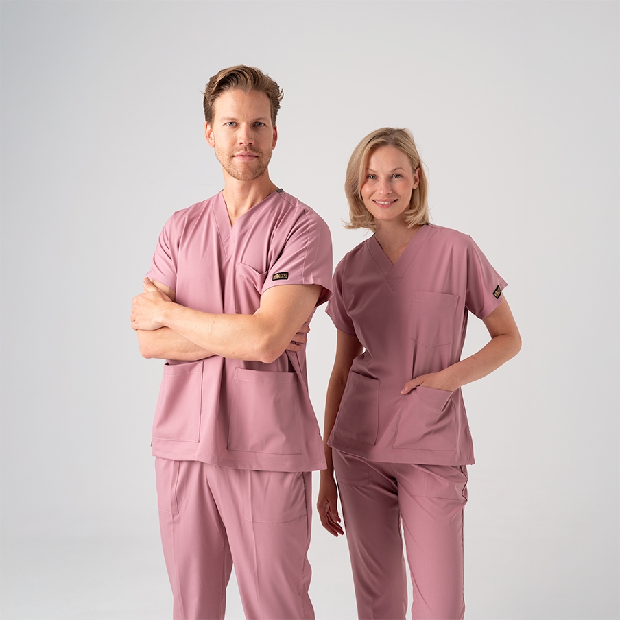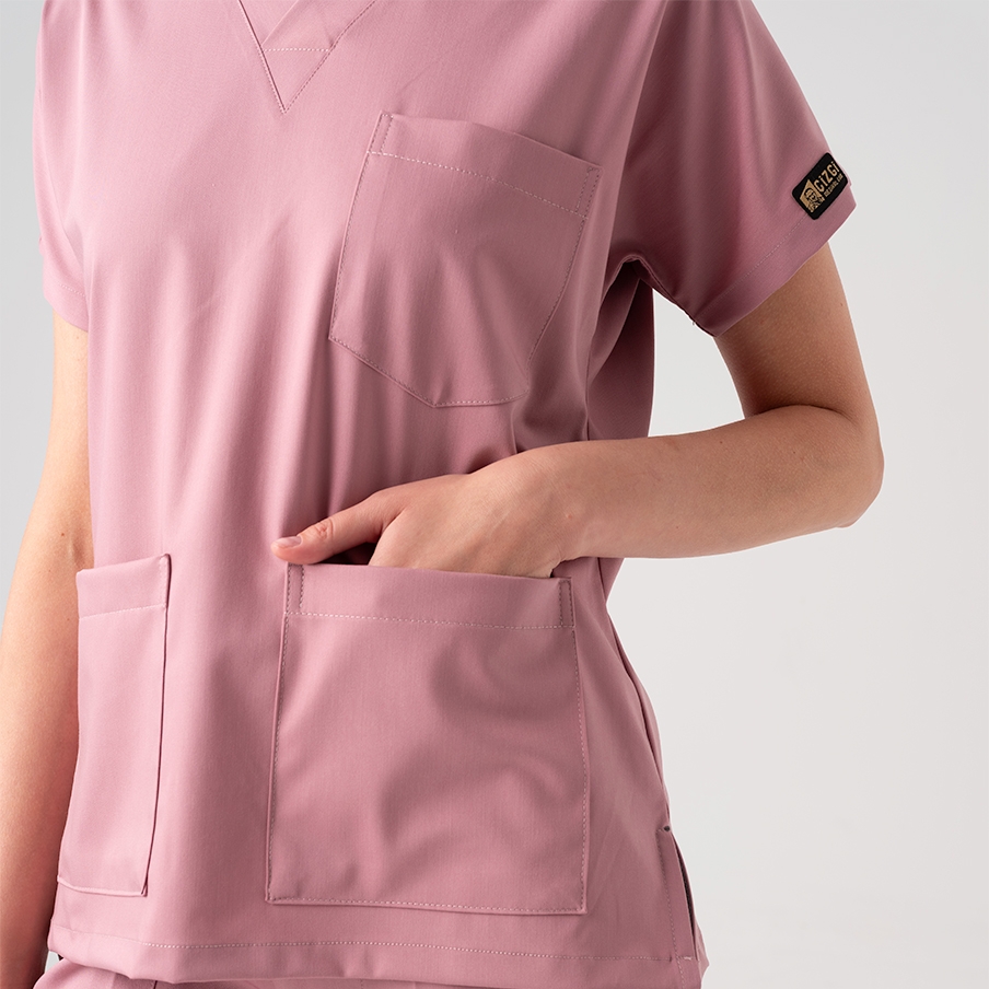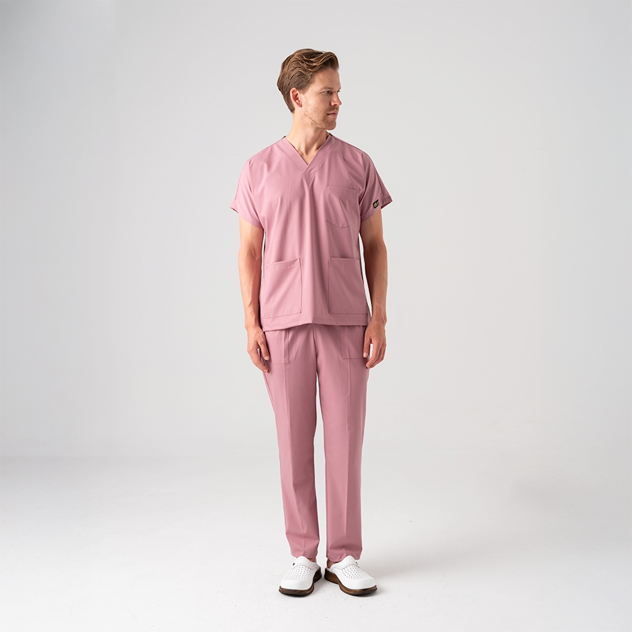 Dusty Rose Dr. Greys Doctor Nurse Medical Scrubs Set Best Lycra Fabric is a surgical scrub set specially designed for the comfort of healthcare professionals. It consists of a V-neck, batwing sleeve top and elastic waist pants. It is suitable for intense work tempos with its non-sweating fabric structure and functional pockets.