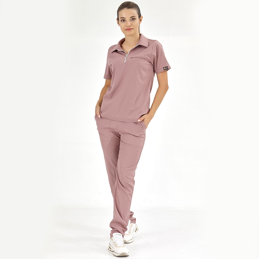 Gül Kurusu Polo Yaka Doktor Hemşire Medikal Scrubs Takım Lüks Likralı Kumaş, sağlık çalışanlarının rahatlığı ve şıklığı için tasarlanmış fermuarlı polo yaka cerrahi takımdır. Esnek yapısı ve nefes alan dokusuyla gün boyu konfor sağlar.