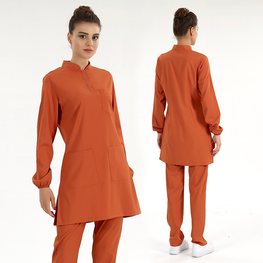 Kiremit Tesettür Hakim Yaka Doktor Hemşire Medikal Scrubs Takım Lüks Likralı Kumaş, tesettürlü sağlık personelleri için özel olarak tasarlanmıştır. Uzun kollu yapısı ve normal cerrahi takımlardan 12 cm daha uzun etek boyu ile tesettür giyim standartlarına uygundur.