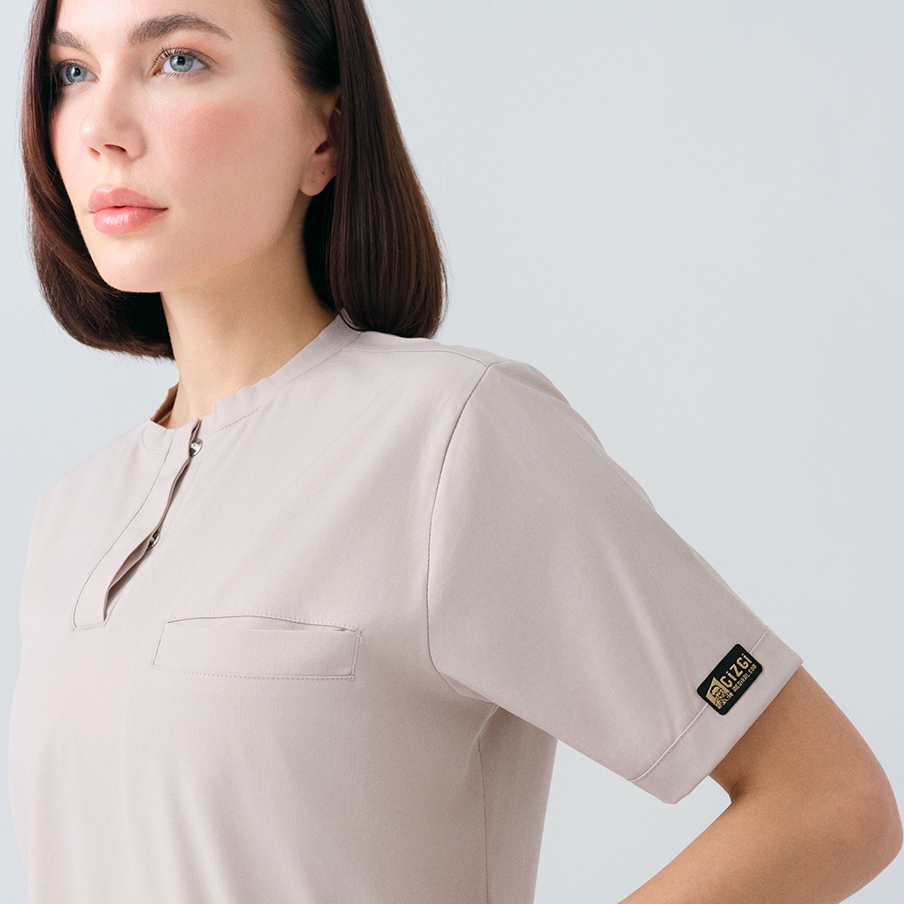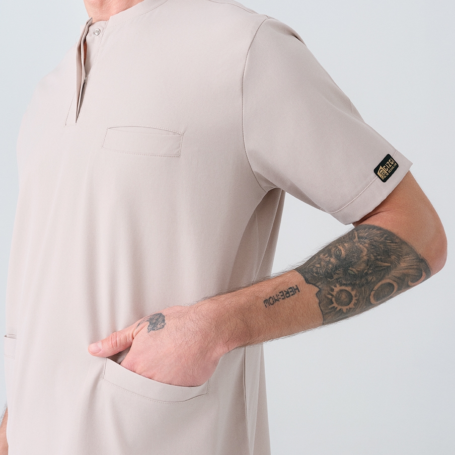 Krem Cool Doktor Hemşire Medikal Scrubs Takım Best Likralı Kumaş, sağlık çalışanlarının rahatlığı ve şıklığı için tasarlanmış gizli patlı ve bisiklet yaka cerrahi takımdır. Asimetrik cep yerleşimi ve modern tasarımıyla fark yaratır.