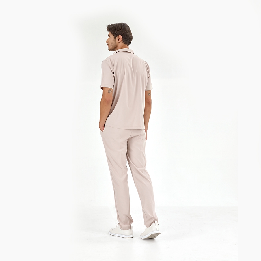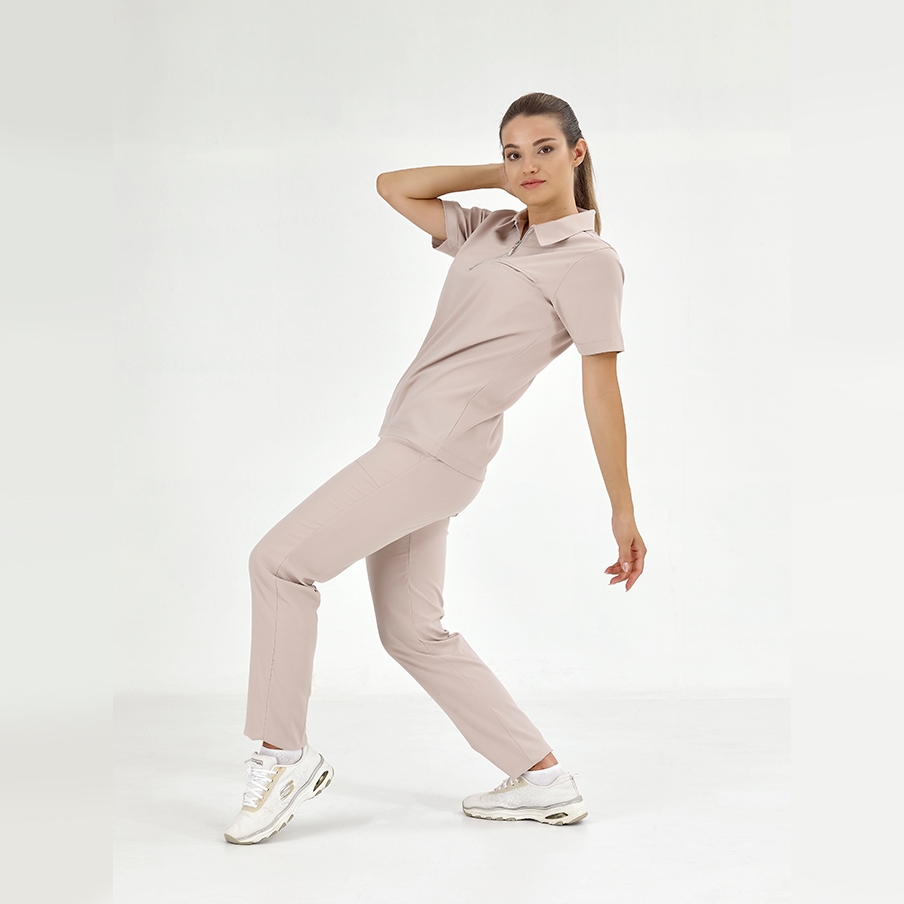 Krem Polo Yaka Doktor Hemşire Medikal Scrubs Takım Lüks Likralı Kumaş, sağlık çalışanlarının rahatlığı ve şıklığı için tasarlanmış fermuarlı polo yaka cerrahi takımdır. Esnek yapısı ve nefes alan dokusuyla gün boyu konfor sağlar.