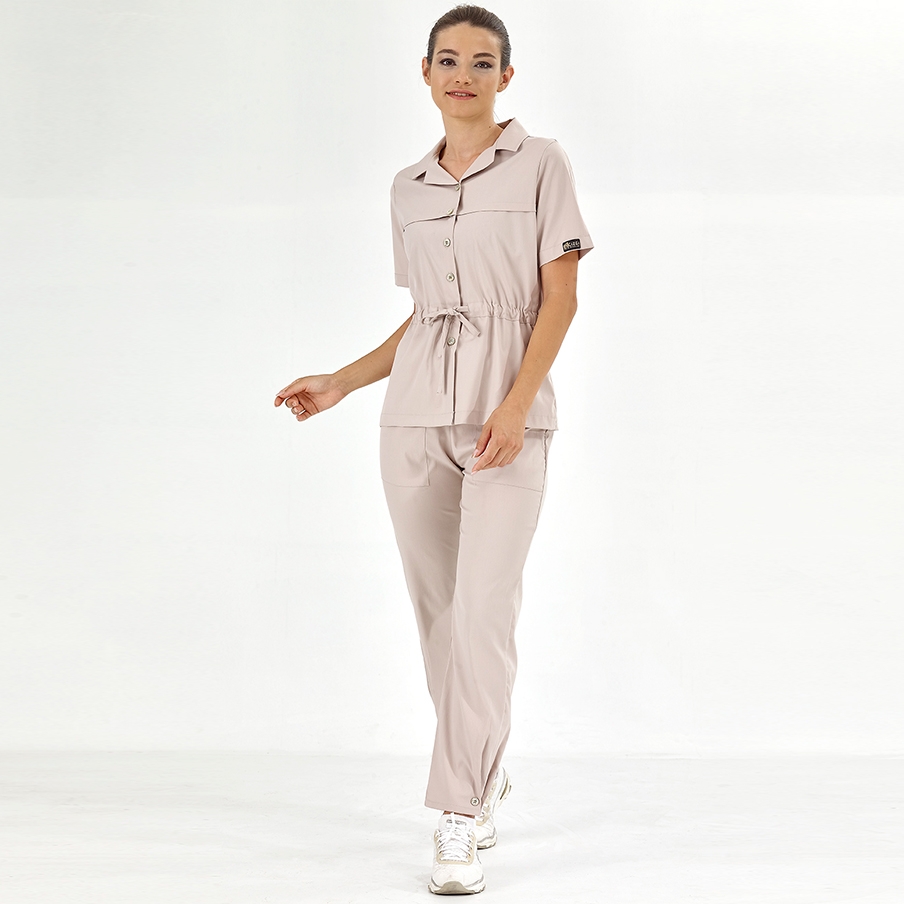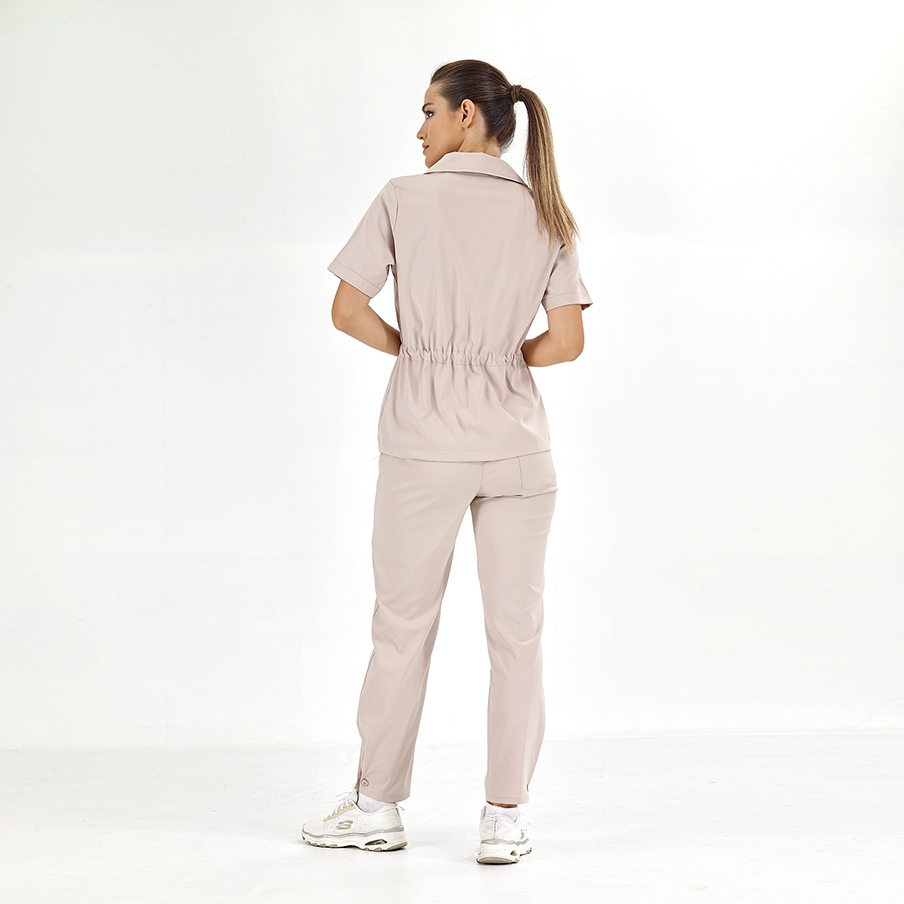 Krem Retro Kadın Doktor Hemşire Medikal Scrubs Takım Lüks Likralı Kumaş, kadın sağlık çalışanlarının şıklığı ve rahatlığı için tasarlanmış klasik yaka ve önden düğmeli cerrahi takımdır. Beldeki büzgü detayı ve paça tasarımıyla zarif bir görünüm sunar.