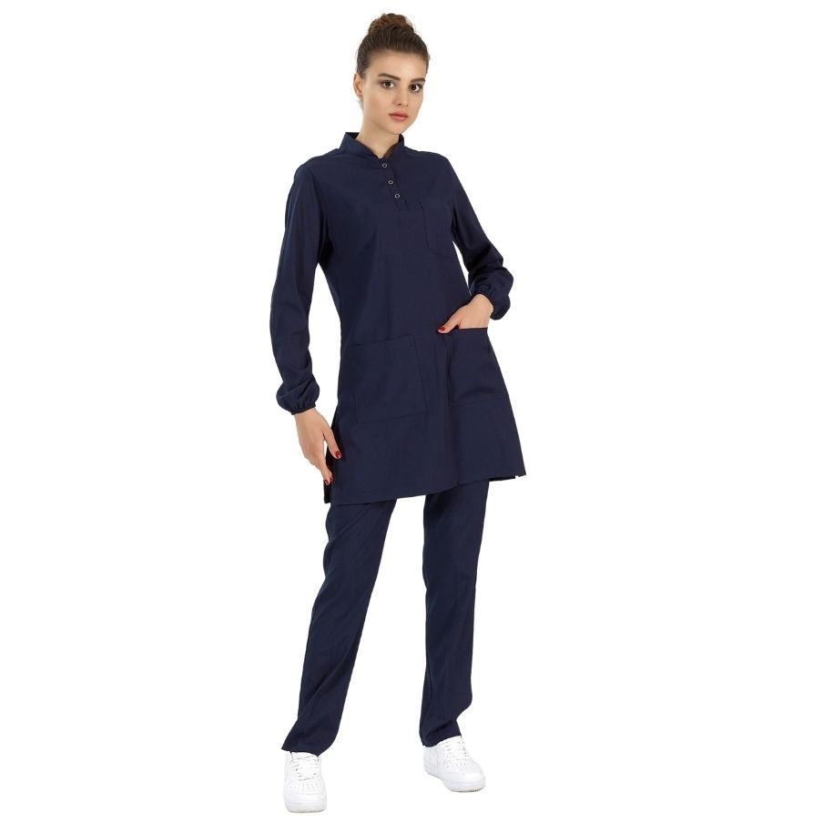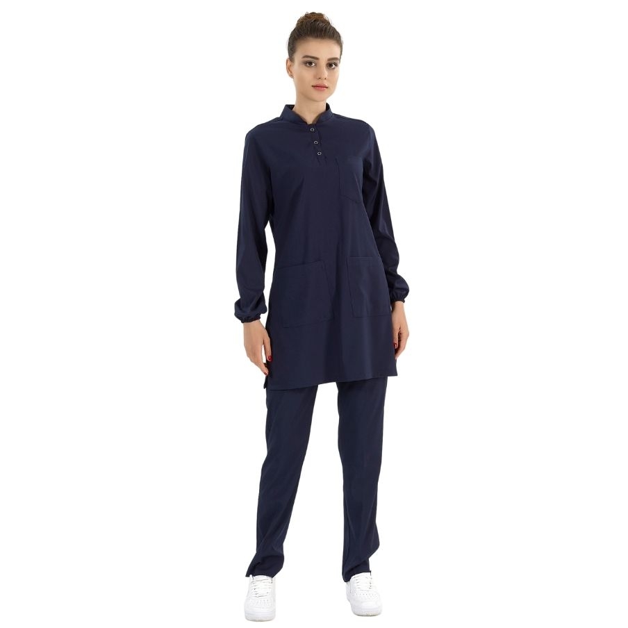 Lacivert Tesettür Hakim Yaka Doktor Hemşire Medikal Scrubs Takım Lüks Likralı Kumaş, tesettürlü sağlık personelleri için özel olarak tasarlanmıştır. Uzun kollu yapısı ve normal cerrahi takımlardan 12 cm daha uzun etek boyu ile tesettür giyim standartlarına uygundur.